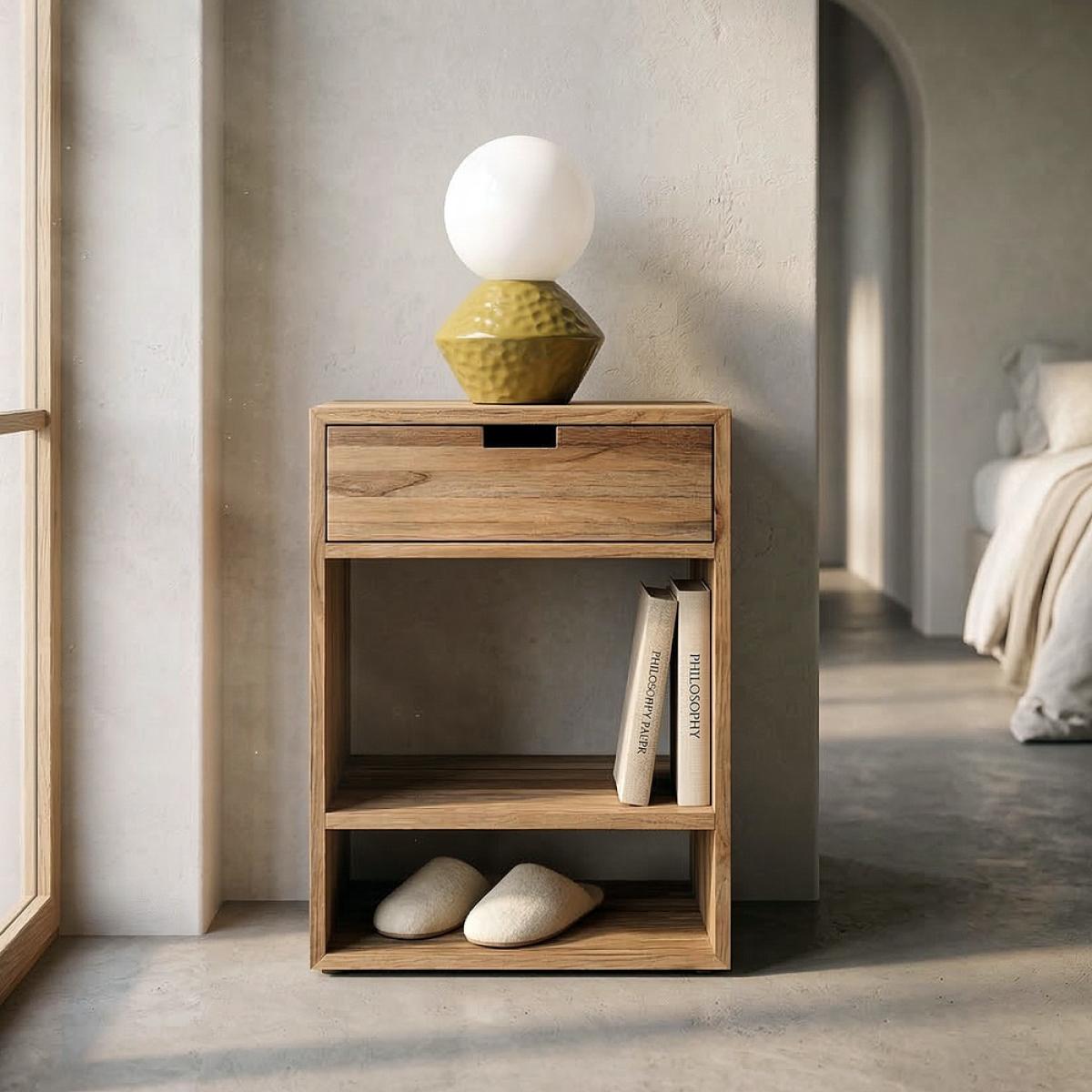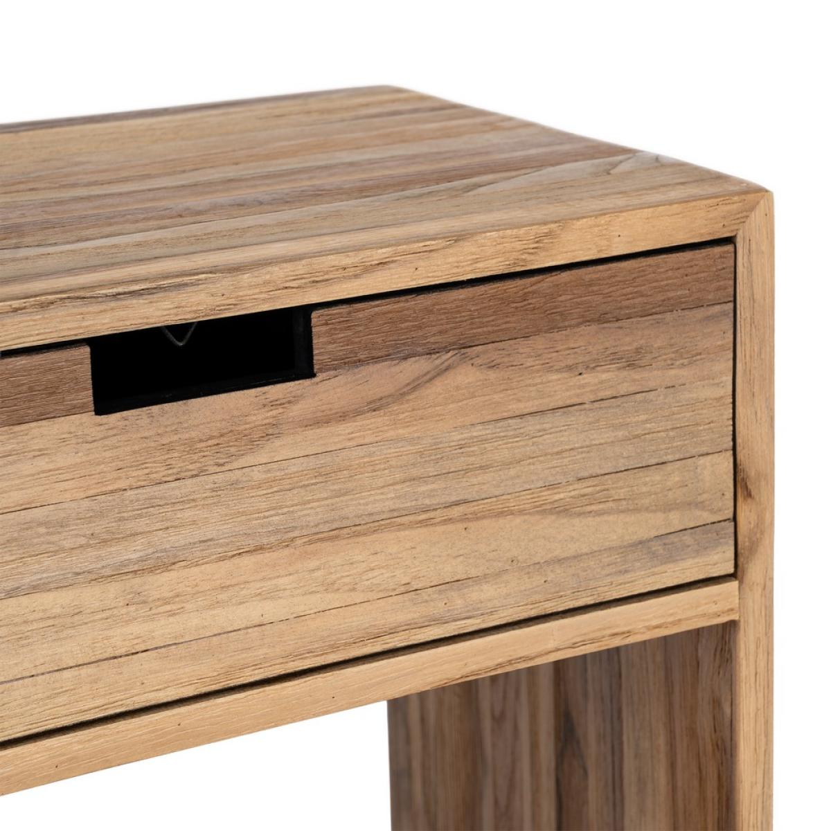 MESITA NATURAL MADERA DE TECA SALÓN 45 X 30 X 60 CM Material: madera de teca reciclada. Cajón: 41x12,5cm. Hueco inferior: 41x13cm. Hueco superior: 41x18cm.