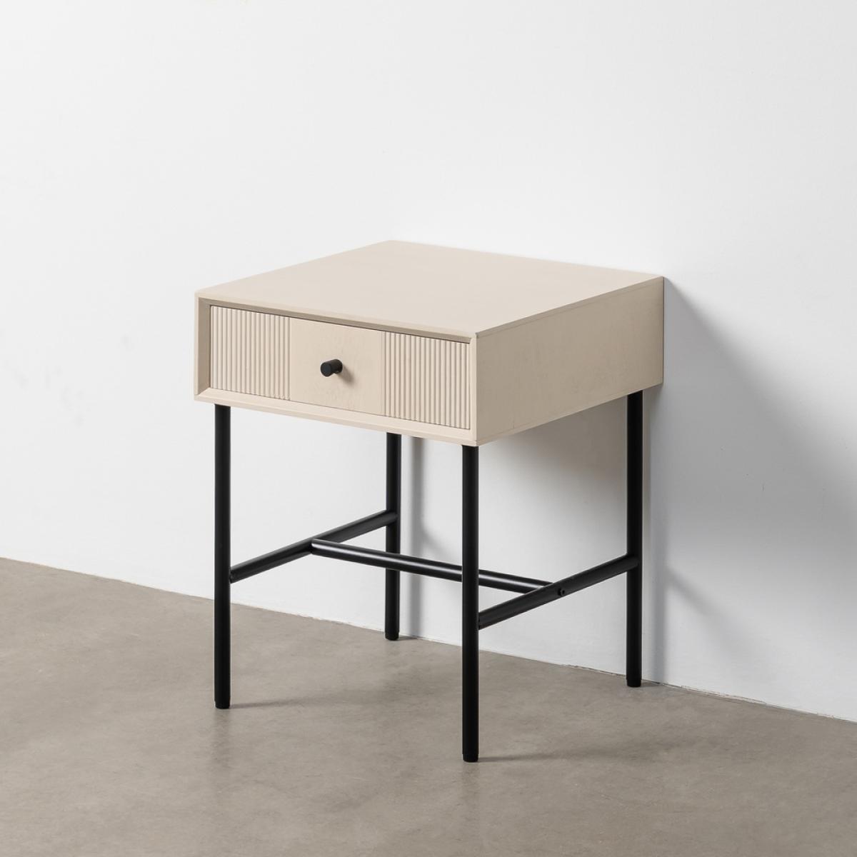 MESITA CREMA DM DORMITORIO 40 X 40 X 49,50 CM Material: Dm. - metal (hierro) Medida cajón: 36.5x10cm. Altura patas: 36cm.