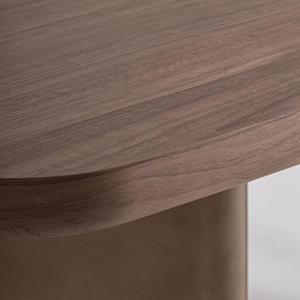 Escritorio Lausana de estilo art deco fabricado en chapa de nogal en color marrón combinado con madera dm y acero inoxidable en color cobre con acabado envejecido.