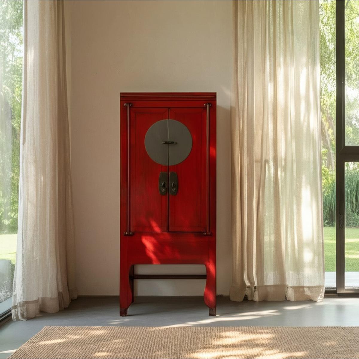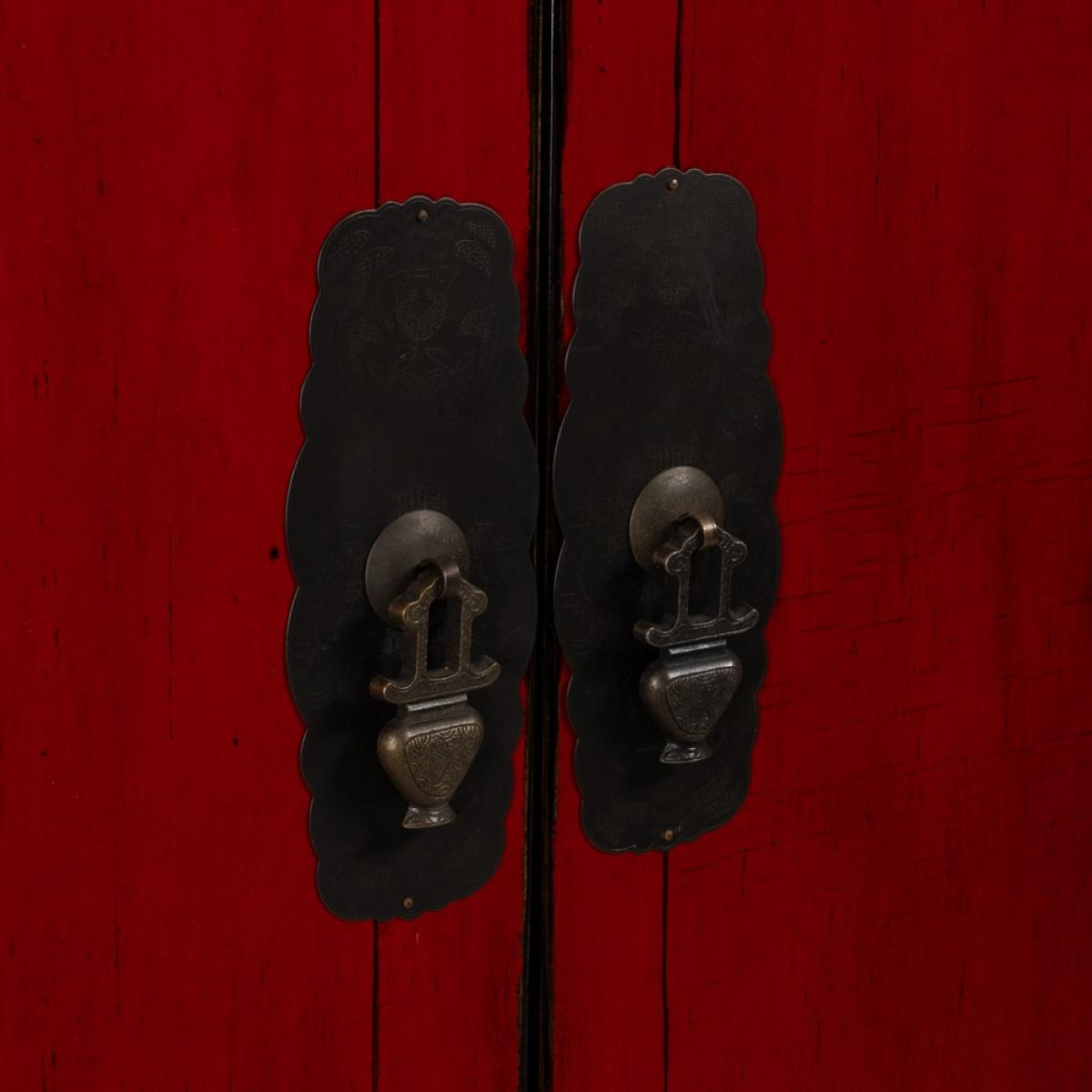 ARMARIO ROJO MADERA-MDF 83,50 X 45 X 195 CM Estructura de madera de pino reciclada. Material cajones: madera de pino y DM. Material tiradores: Cobre. Medidas de las puertas: 35,5x109,5cm. Altura patas: 44 cm. Peso soportado: 100kgs. Pieza artesanal, la medida puede variar ligeramente.