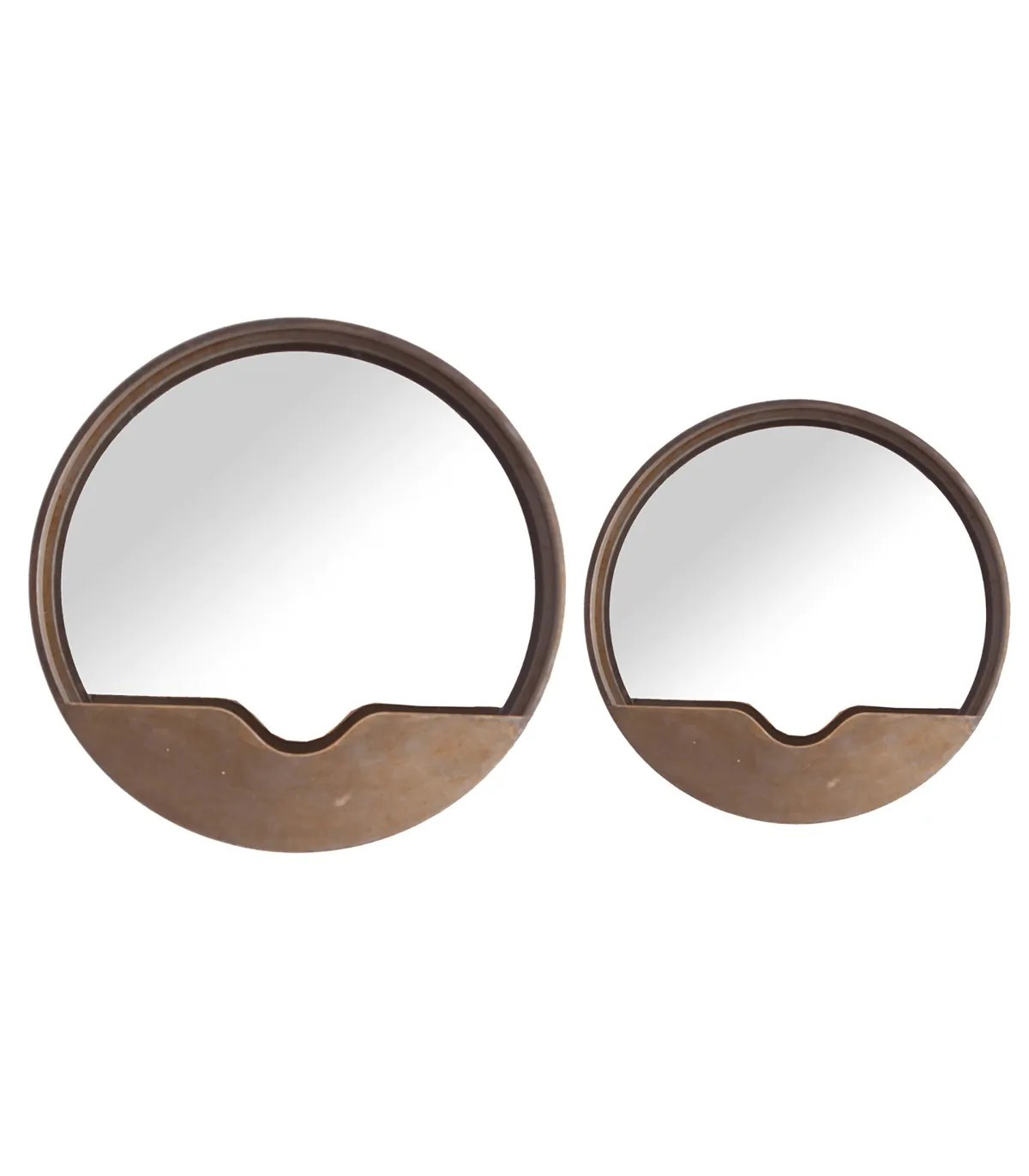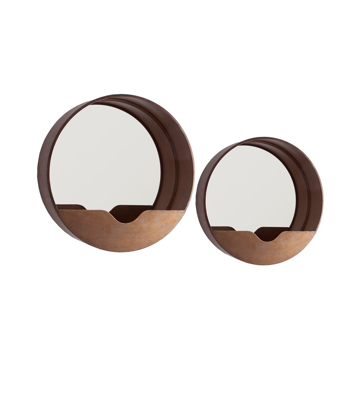 Espejo j/2 redondo thusis, en color oro viejo, de estilo industrial. Fabricado en hierro, combinado con madera dm y espejo.