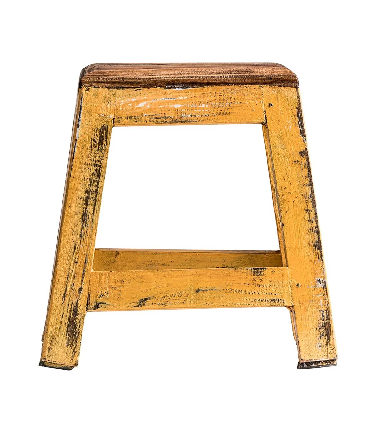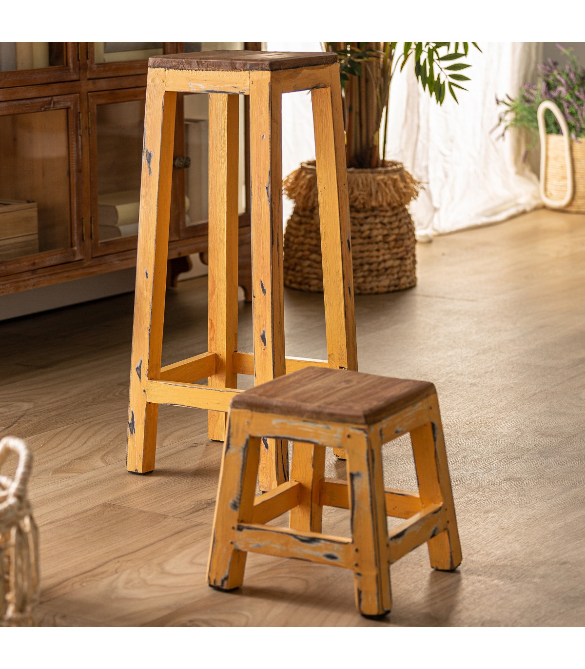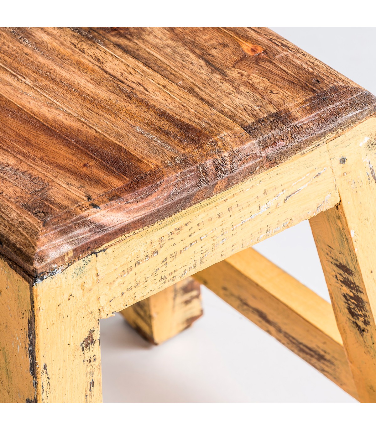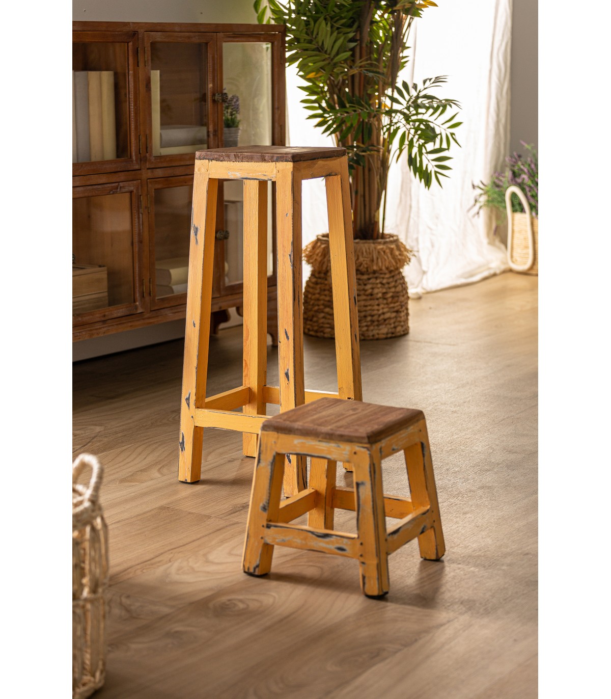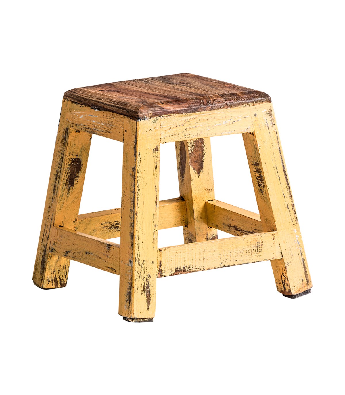Reposapiés buzet, en color mostaza decapado, de estilo kitsh. Fabricado en madera de mahogany.