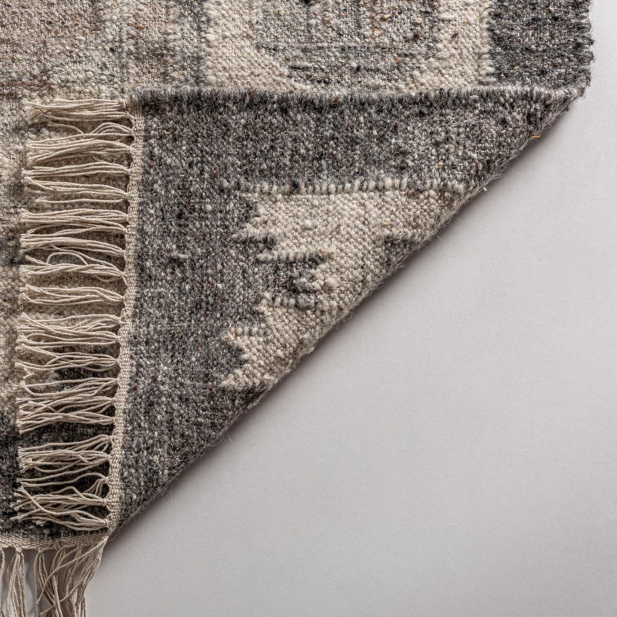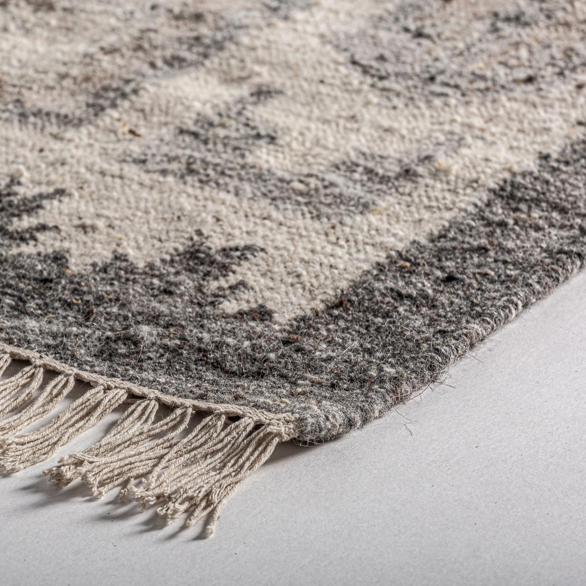 Alfombra kiara de estilo clásico fabricado en lana en color gris combinado con algodón en color crema y fibra natural.