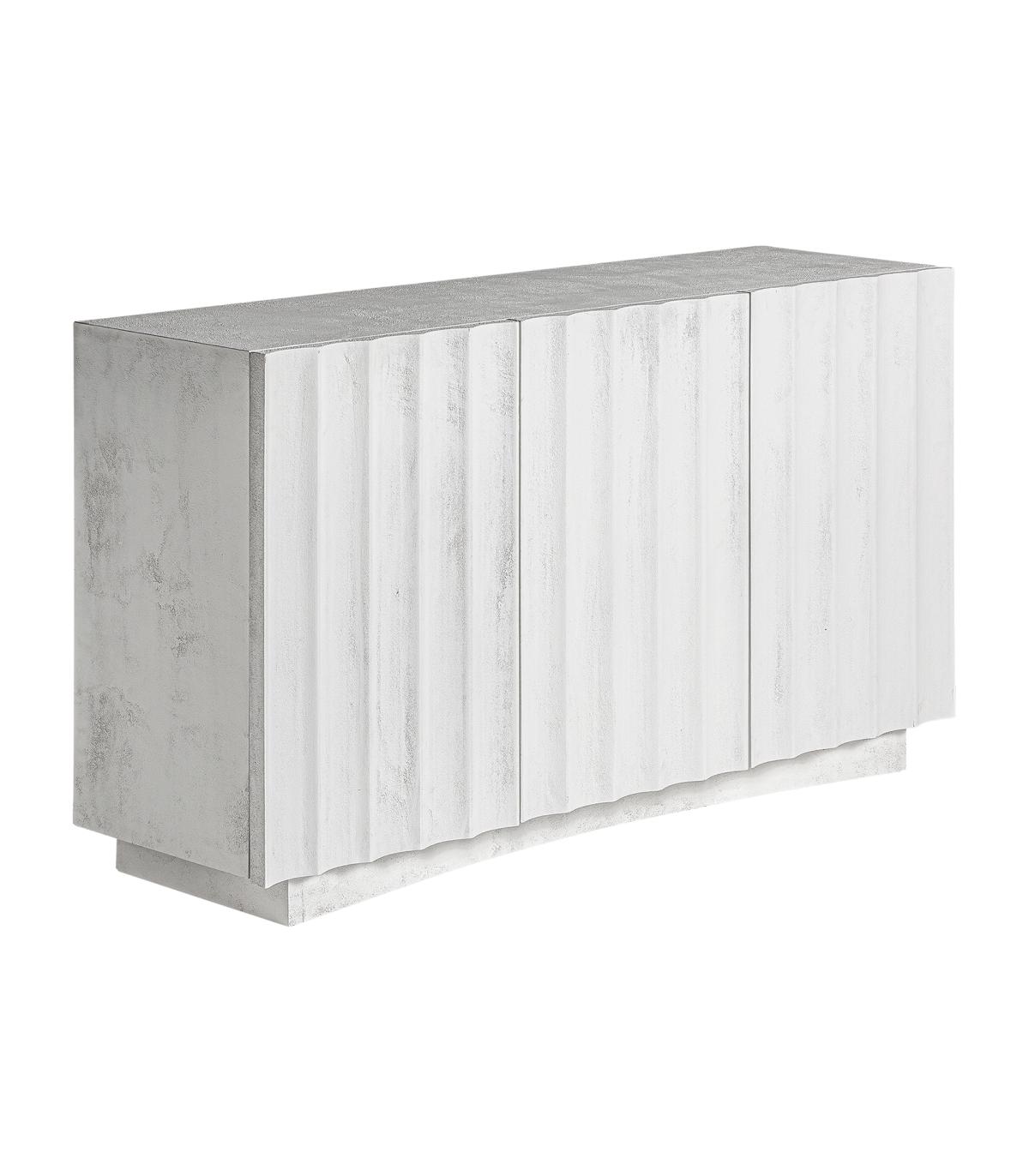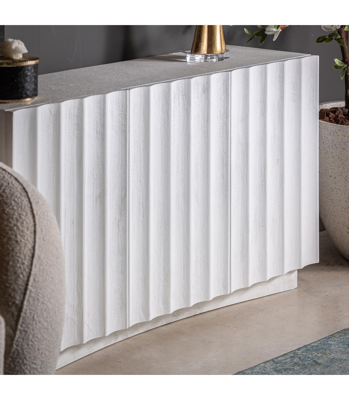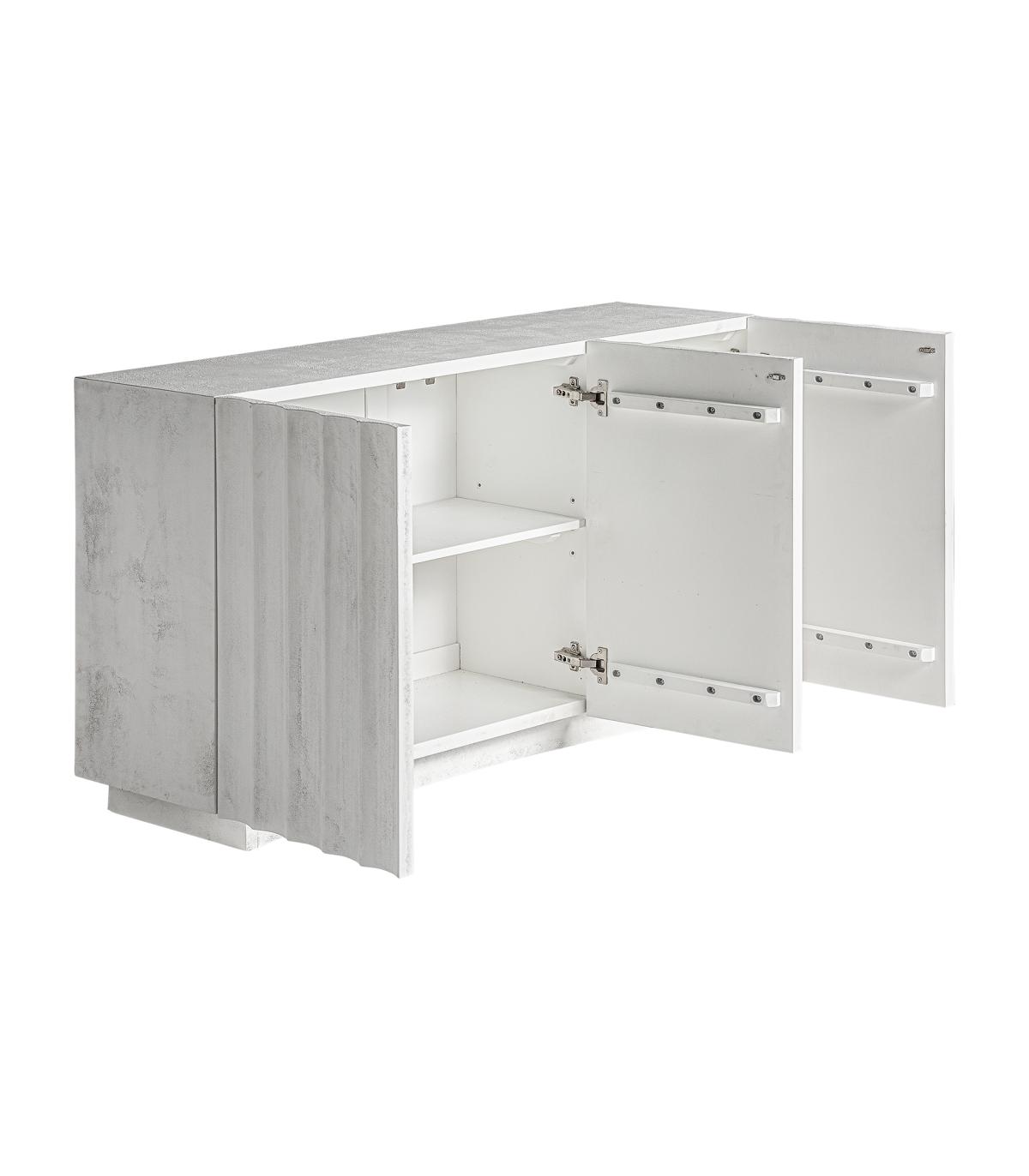 Aparador Mulcey de estilo contemporáneo fabricado en madera dm en color blanco combinado con cemento en color blanco y resina. El acabado se realiza con una mezcla de cemento blanco resina arena de grava y endurecedor. .