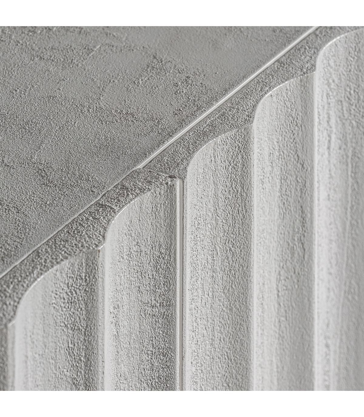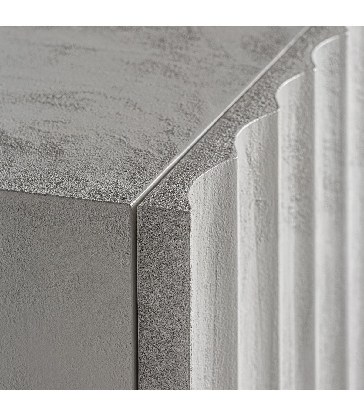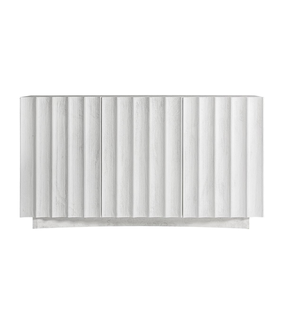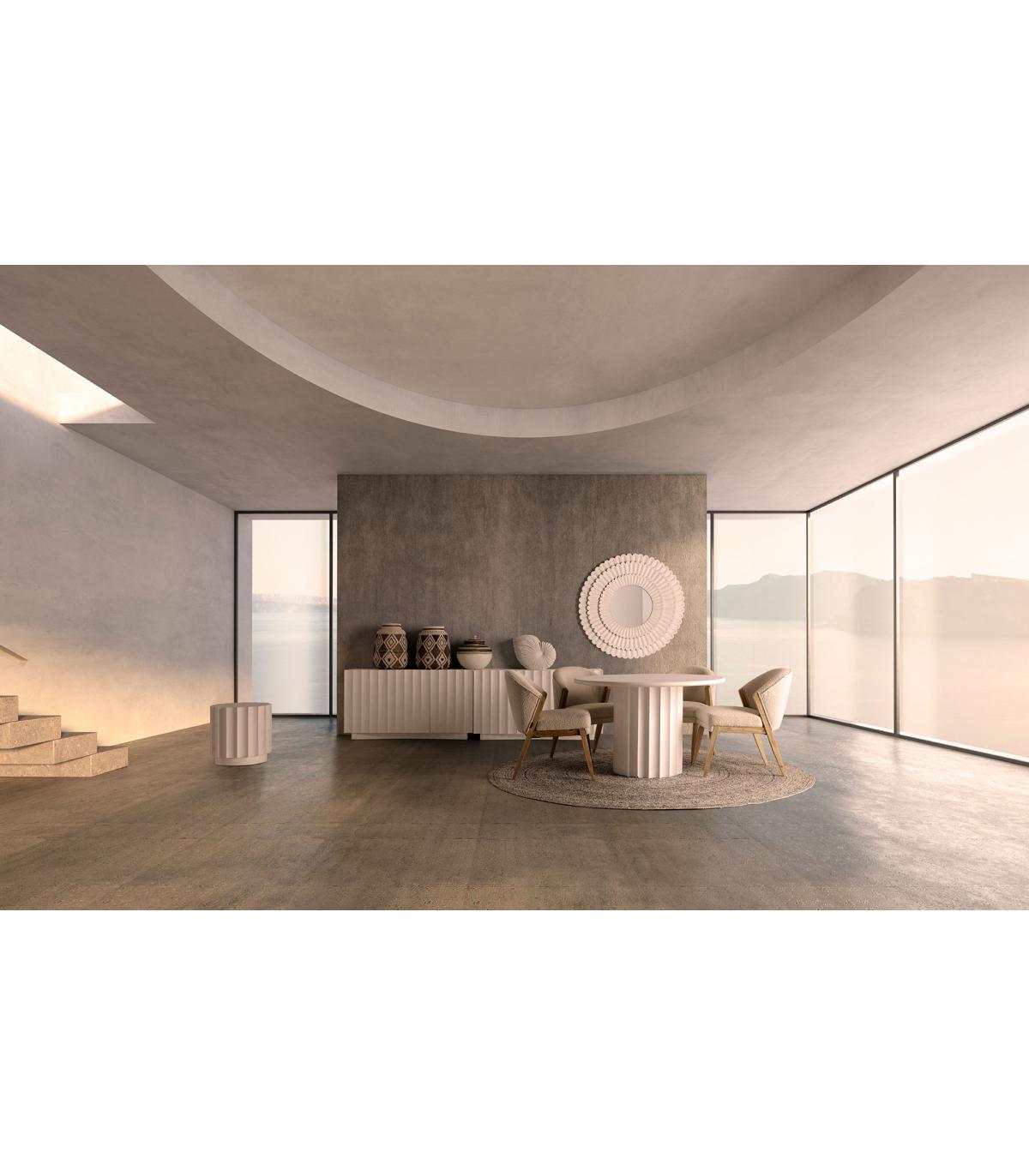 Aparador Mulcey de estilo contemporáneo fabricado en madera dm en color blanco combinado con cemento en color blanco y resina. El acabado se realiza con una mezcla de cemento blanco resina arena de grava y endurecedor. .