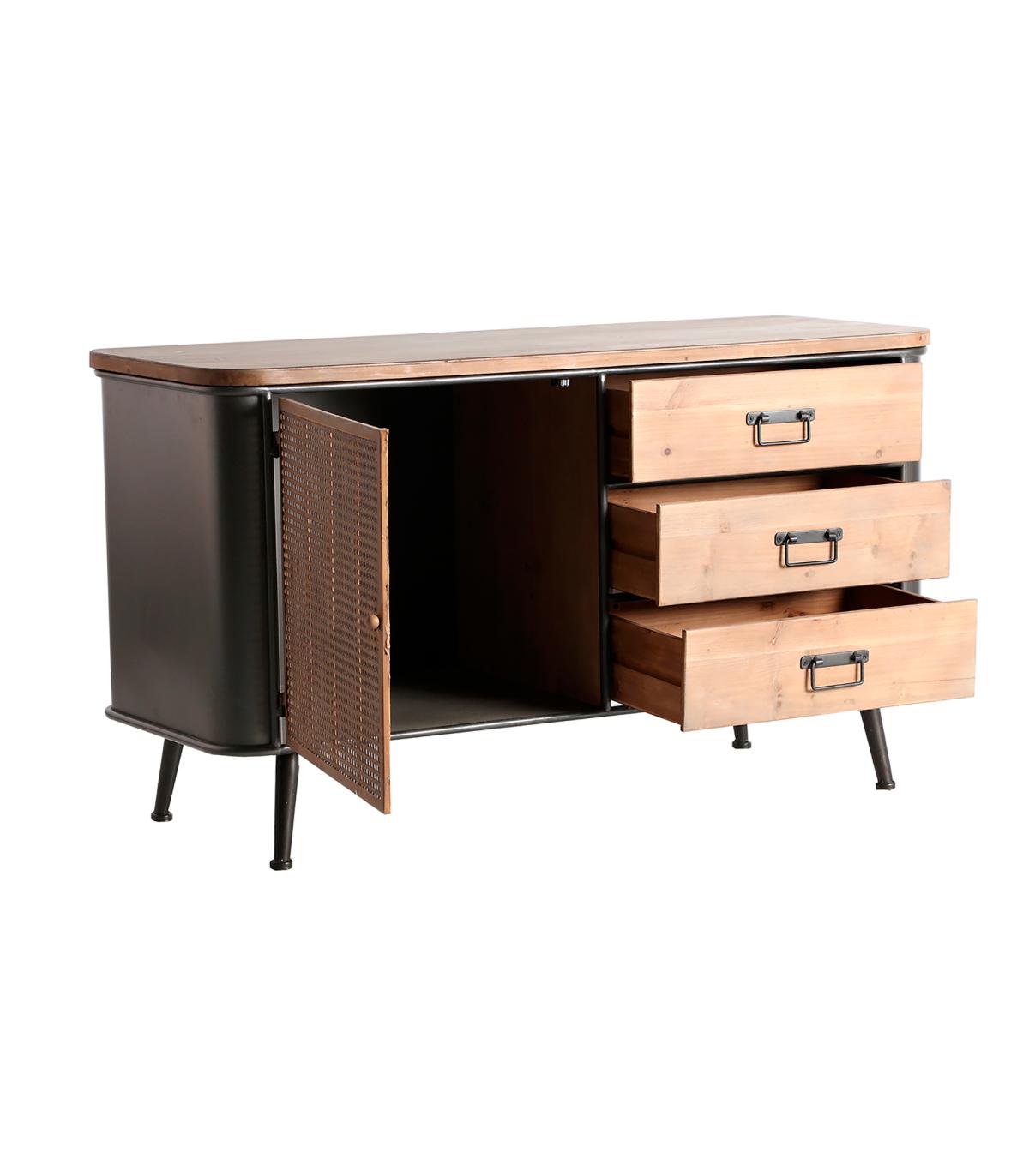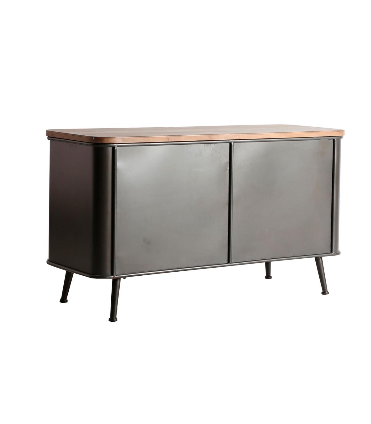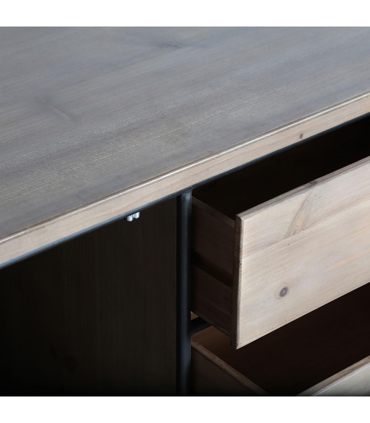 Aparador rectangular tirkane de estilo industrial, fabricado en hierro en color gris, combinado con madera de abeto en color marrón. Producto desmontable.