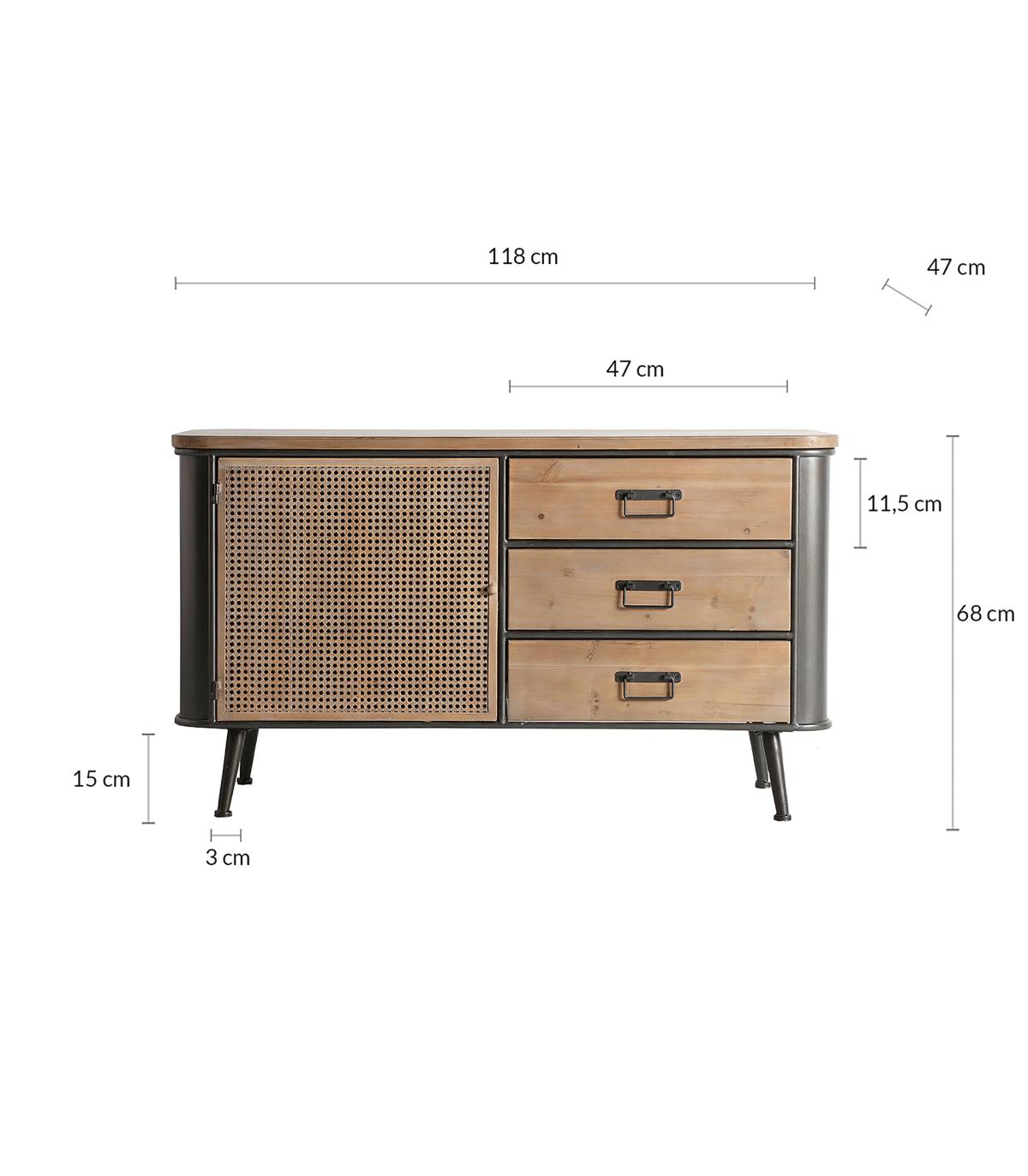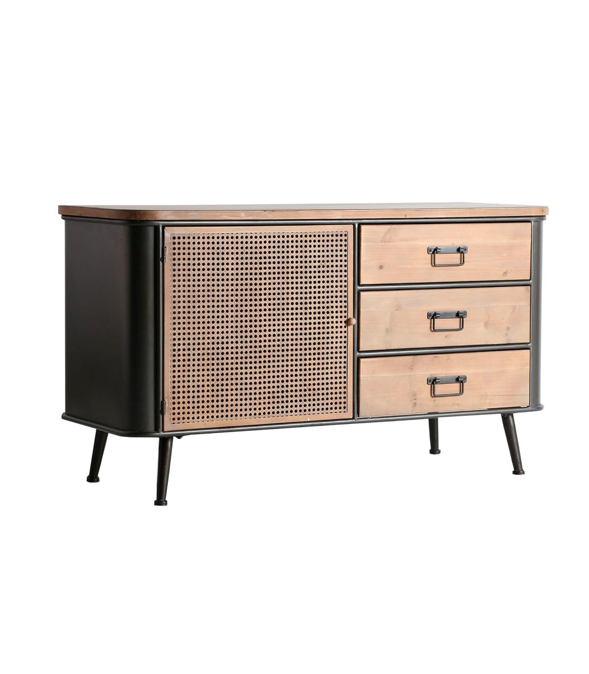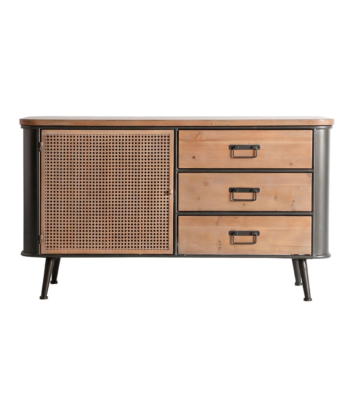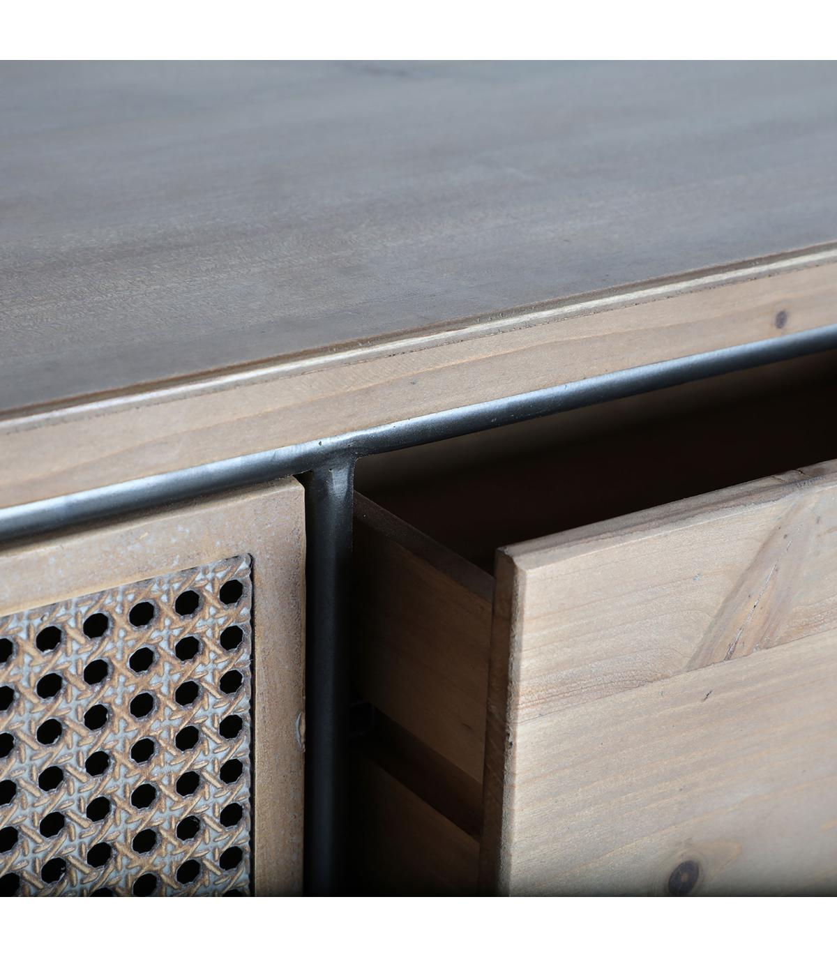 Aparador rectangular tirkane de estilo industrial, fabricado en hierro en color gris, combinado con madera de abeto en color marrón. Producto desmontable.