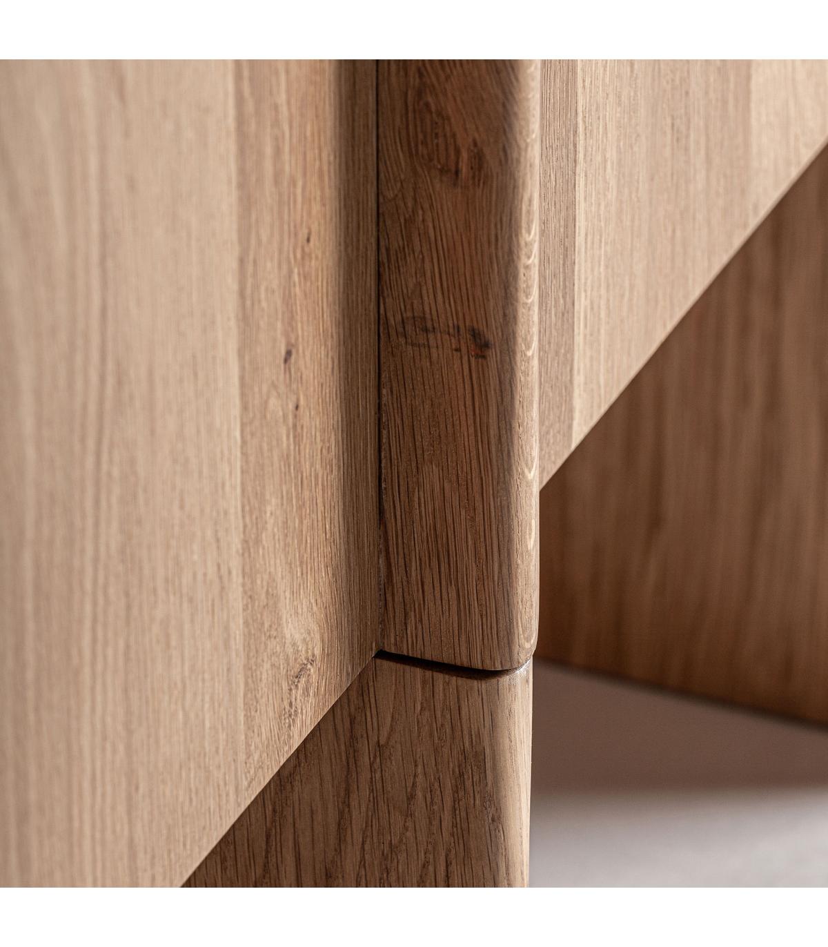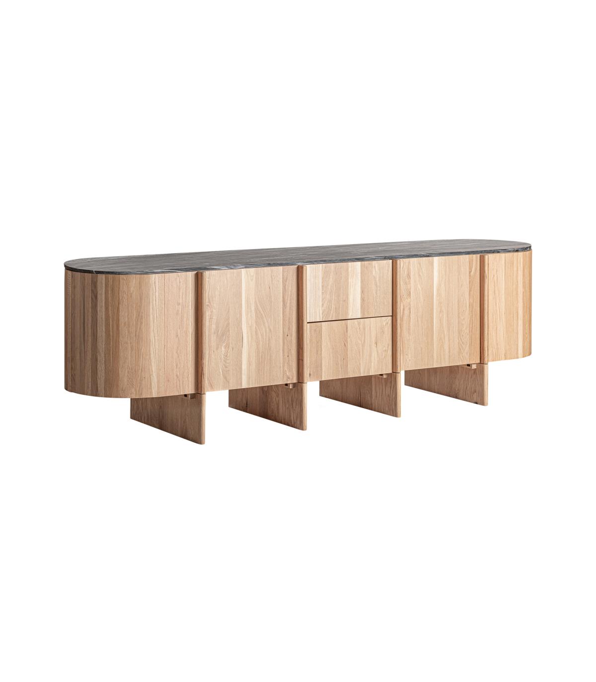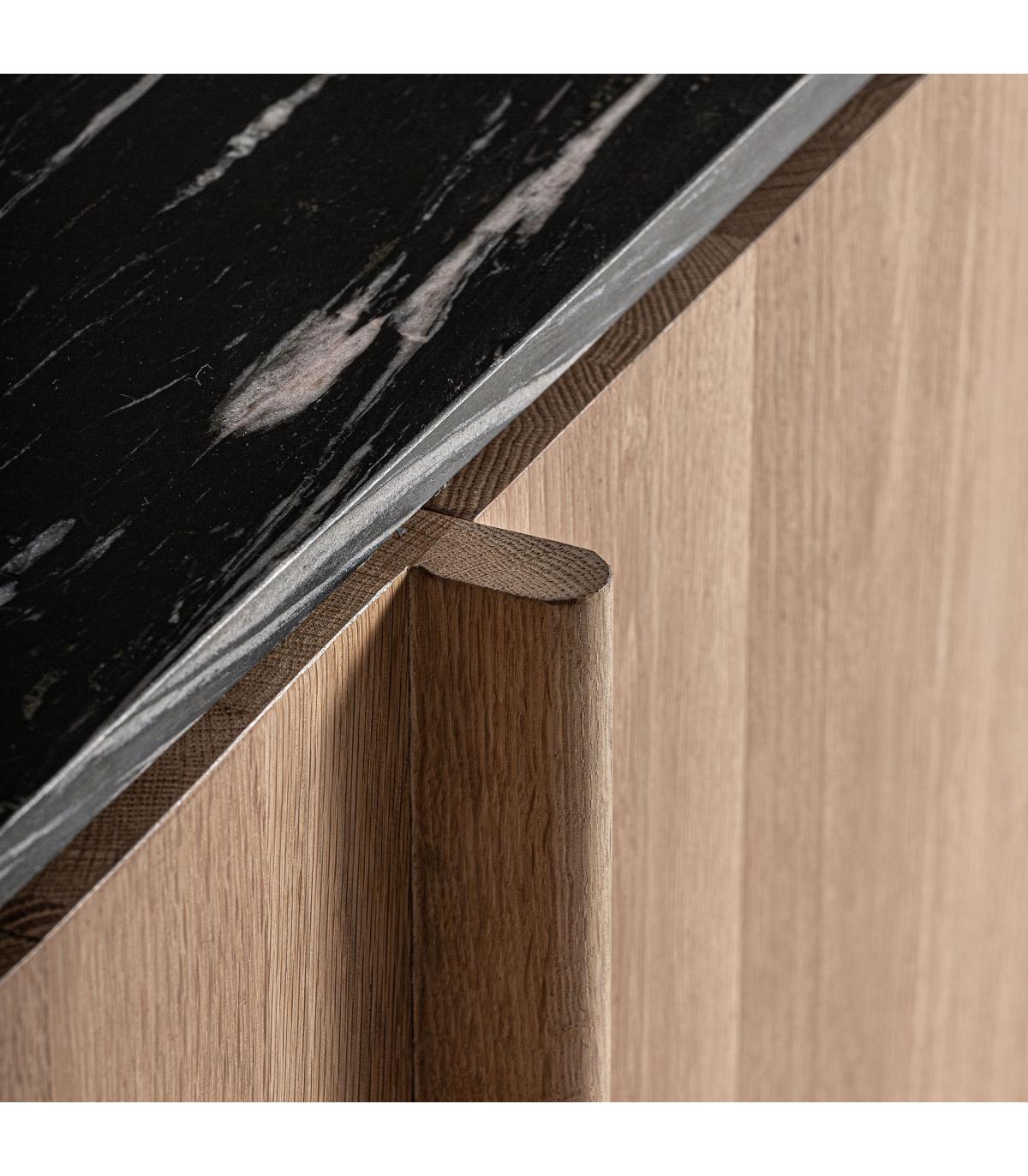 Aparador Nara de estilo contemporáneo fabricado en madera roble en color marrón claro combinado con mármol en color negro.