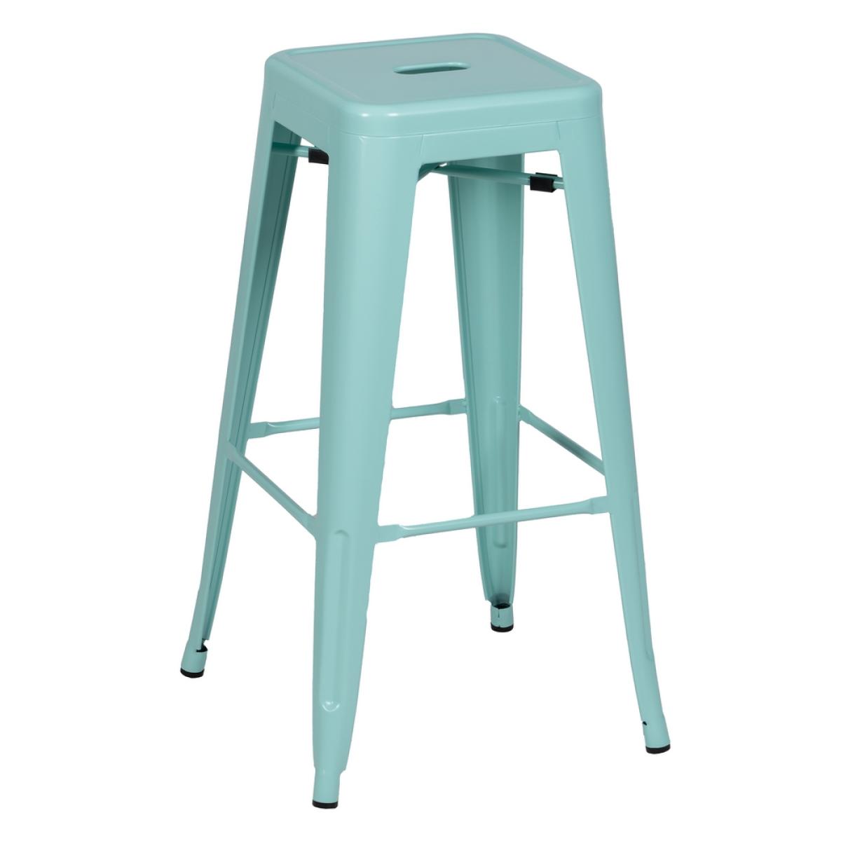 TABURETE TURQUESA METAL DALLAS 43,50 X 43,50 X 76,50 CM Material: acero Altura asiento: 76.5cm. Cumple normativa EN12520:2016 No apilable.