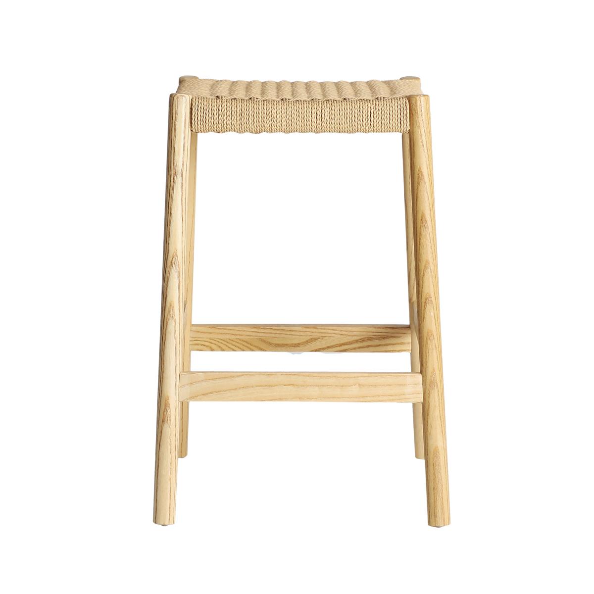 Taburete Valjea de estilo colonial, fabricado en madera de olmo en color marrón claro.