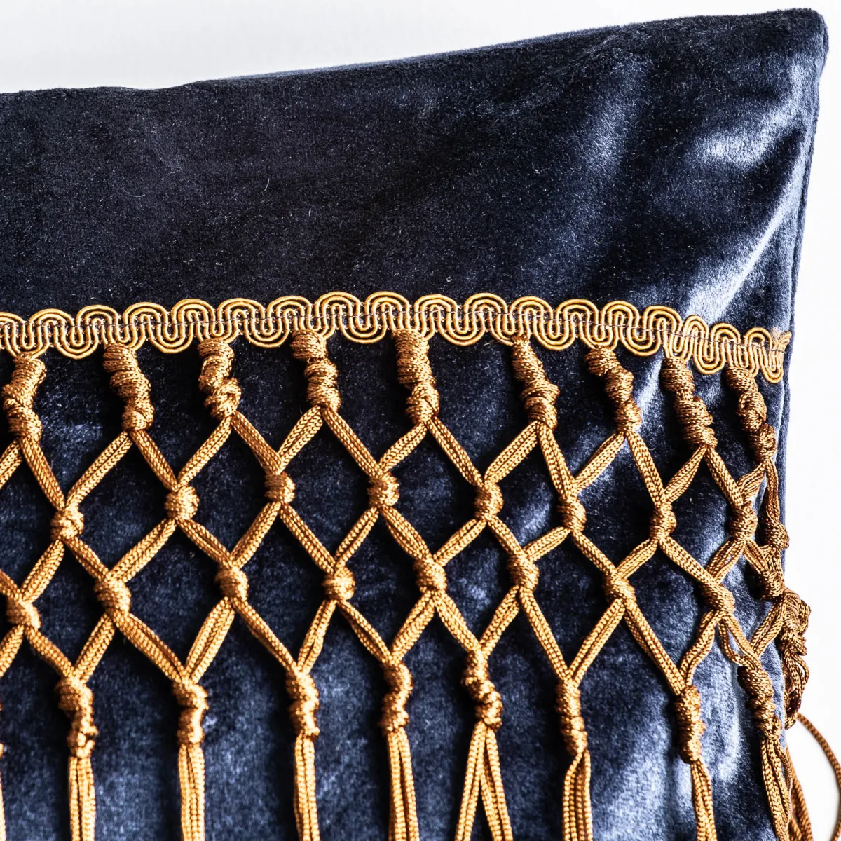 Cojín desa de estilo kitsh fabricado en terciopelo en color azul combinado con poliéster en color marrón y plumas.