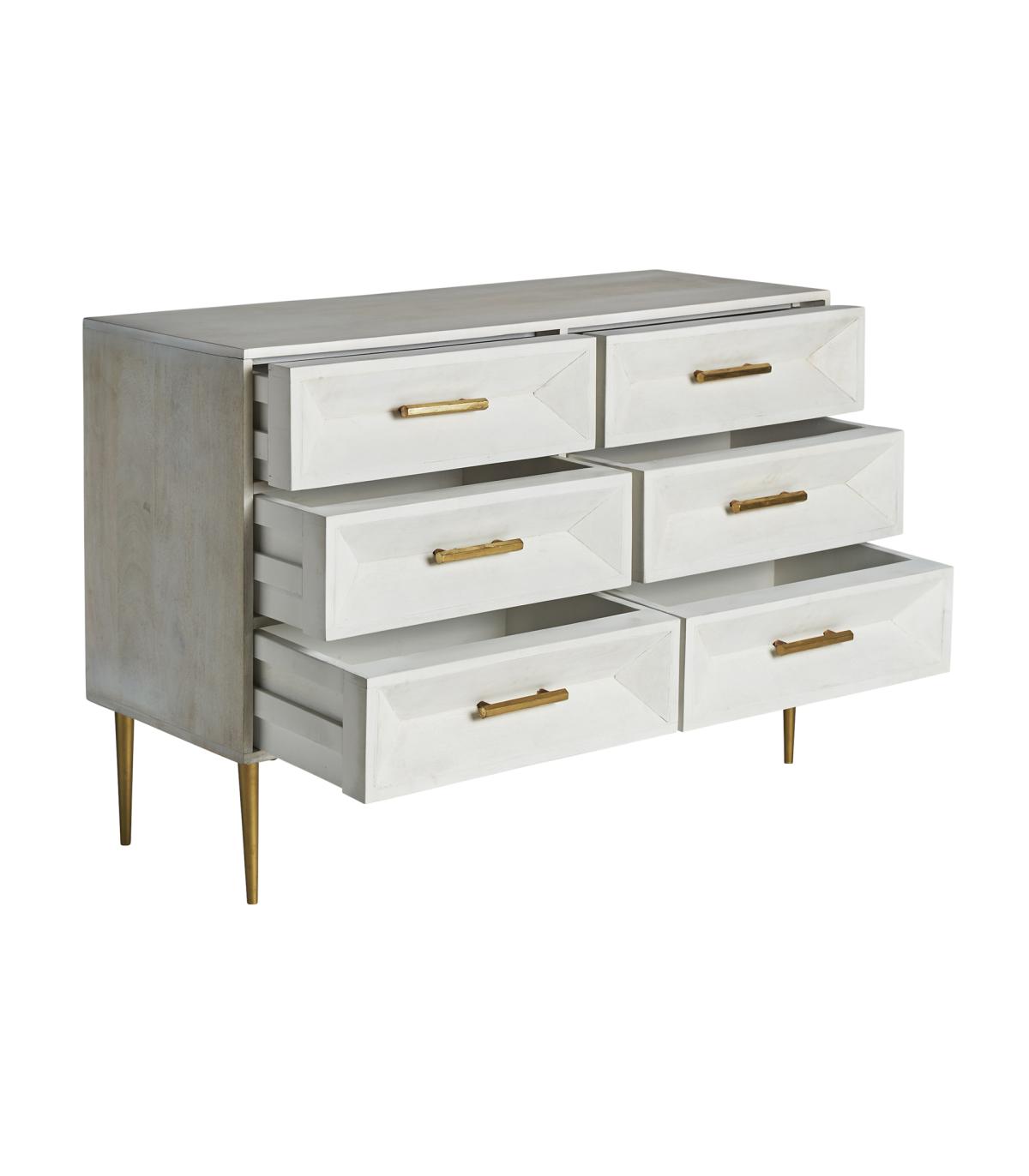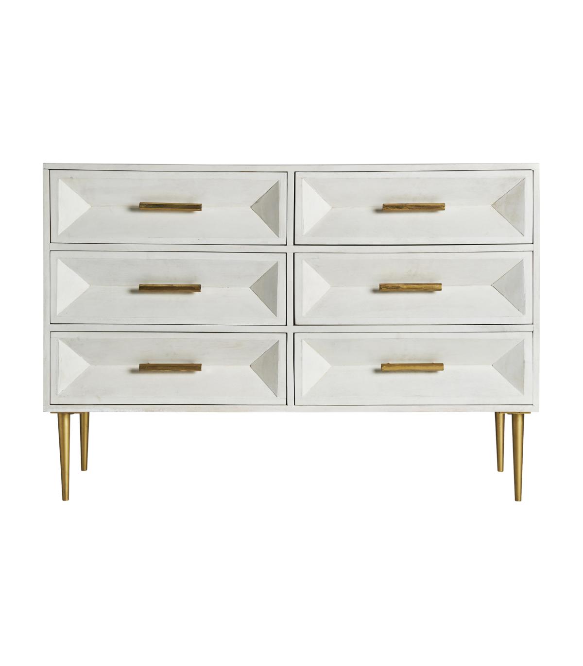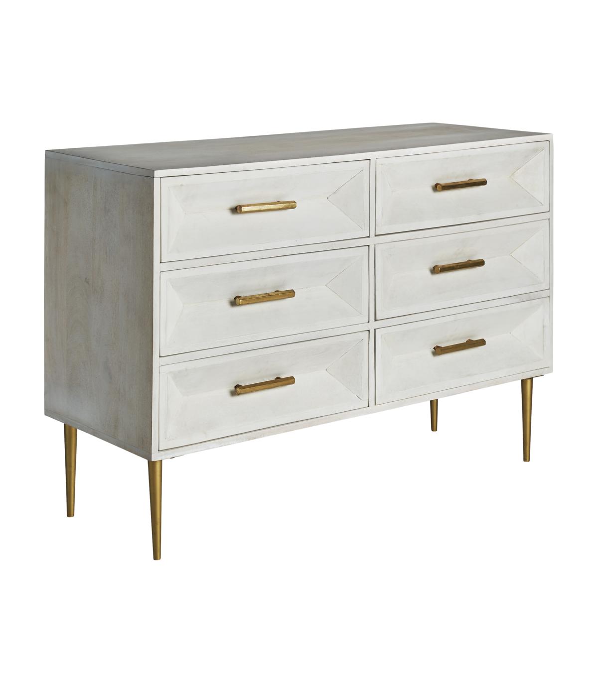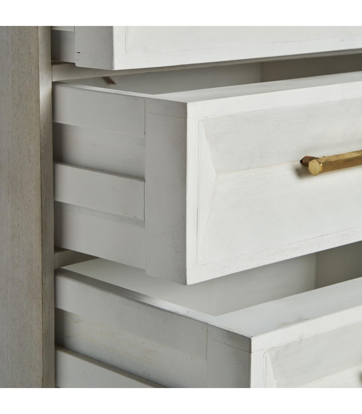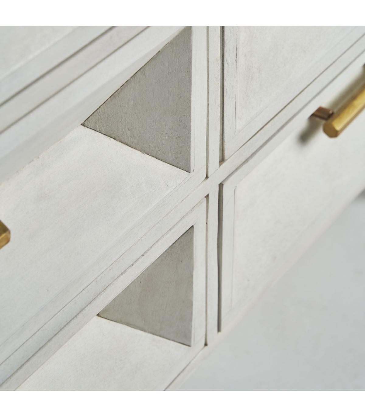 Cómoda kempten de estilo art deco fabricado en madera de mango en color crema combinado con madera dm en color oro con acabado viejo y hierro. Producto desmontable.