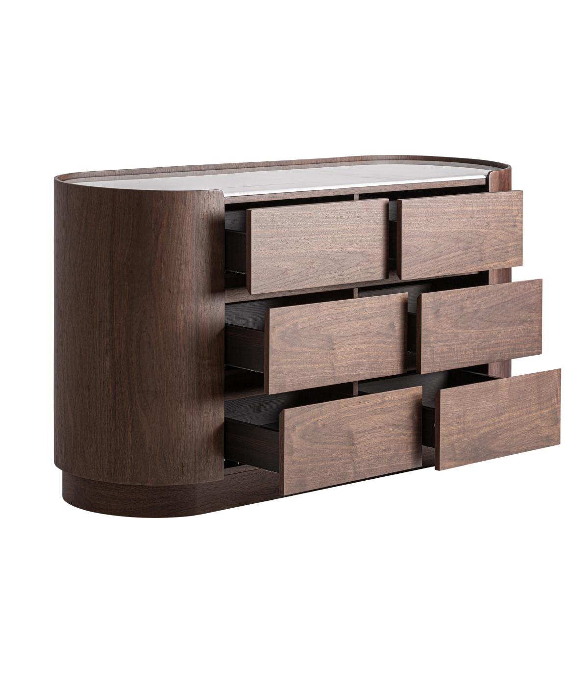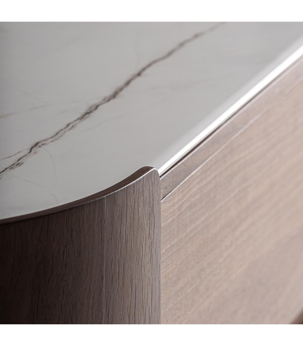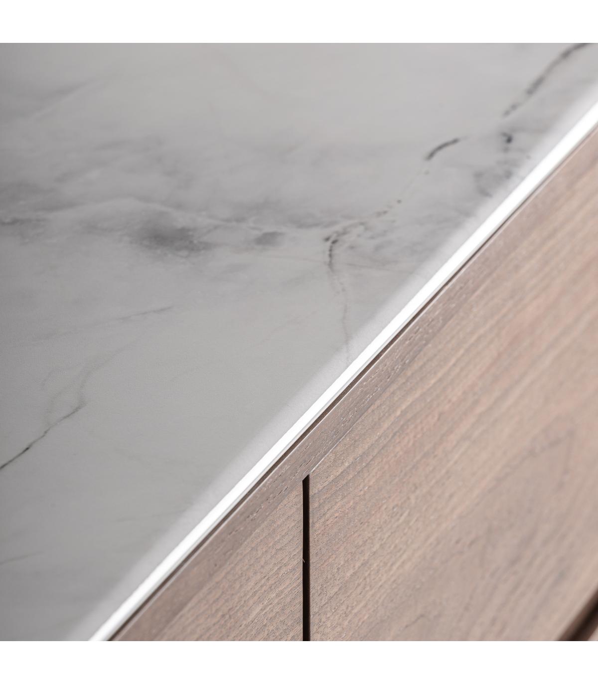 Cómoda Stuetta de estilo contemporáneo fabricado en madera contrachapada en color marrón combinado con chapa de roble y piedra sinterizada en color blanco con acabado veteado.