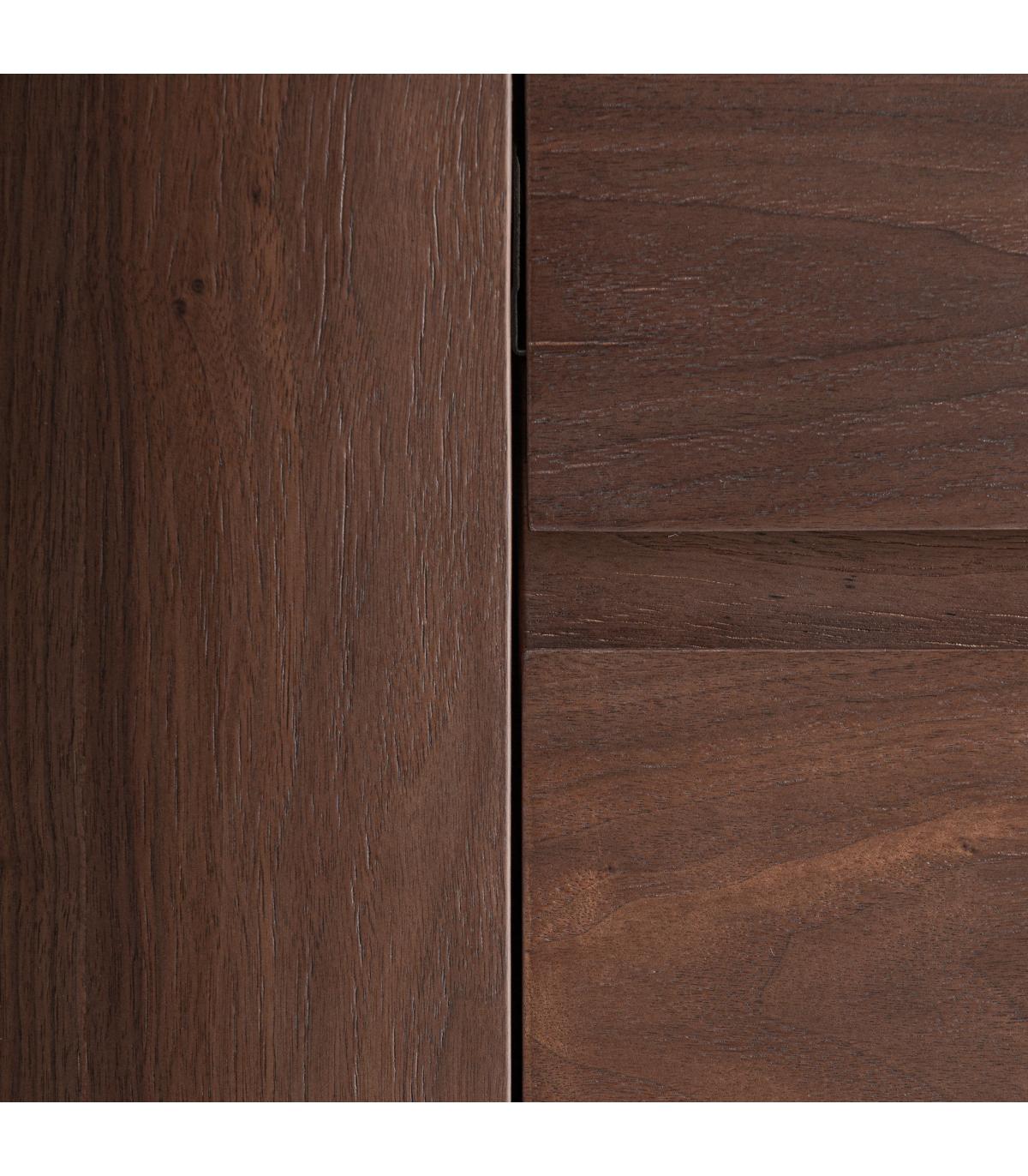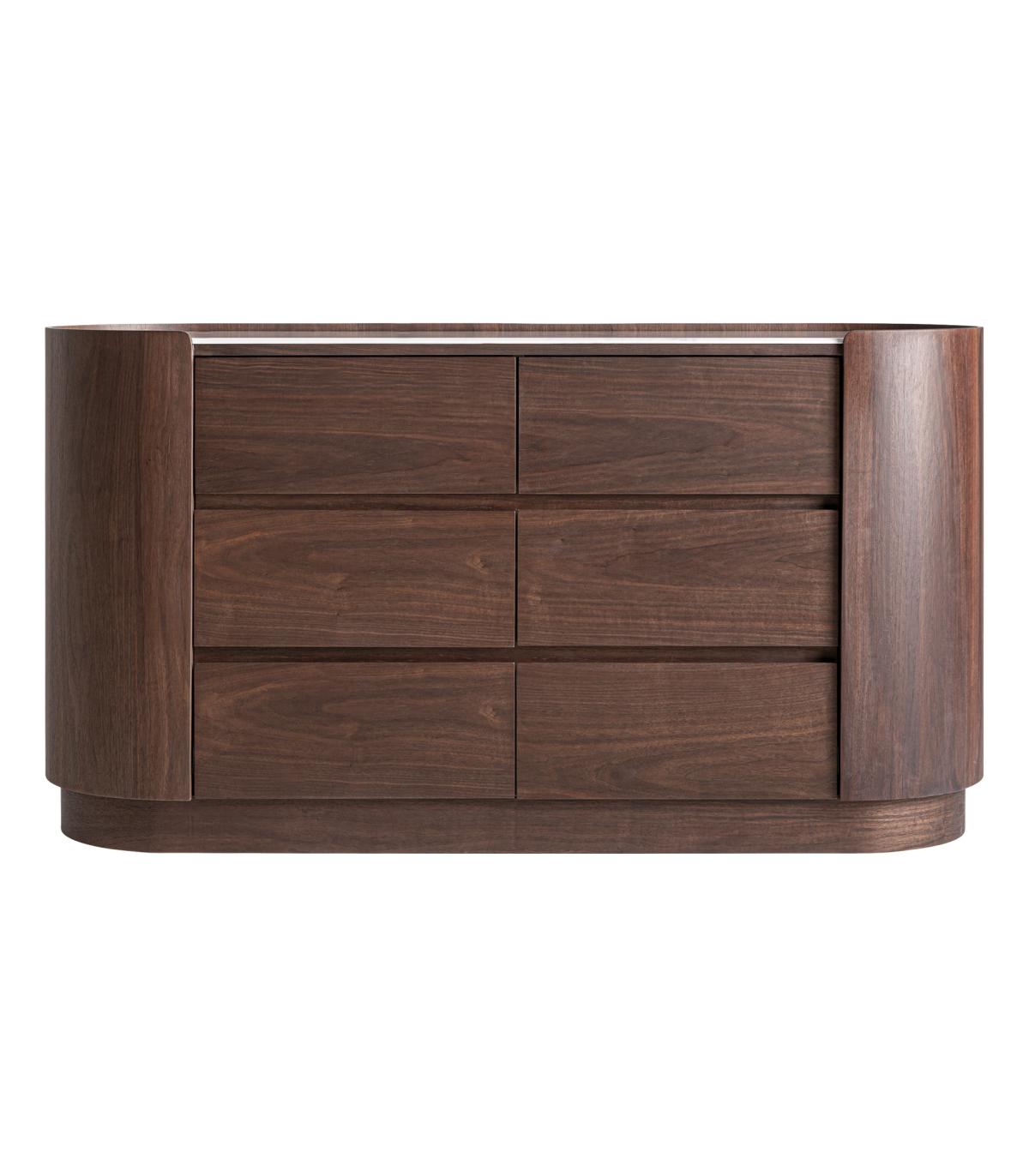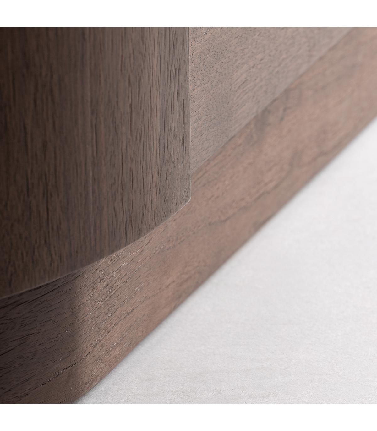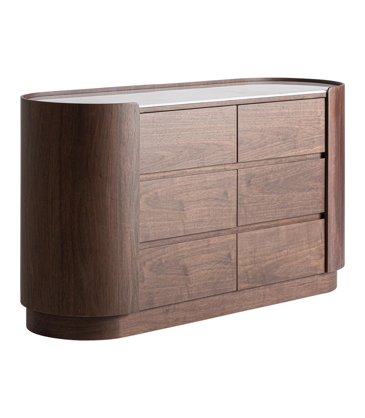 Cómoda Stuetta de estilo contemporáneo fabricado en madera contrachapada en color marrón combinado con chapa de roble y piedra sinterizada en color blanco con acabado veteado.