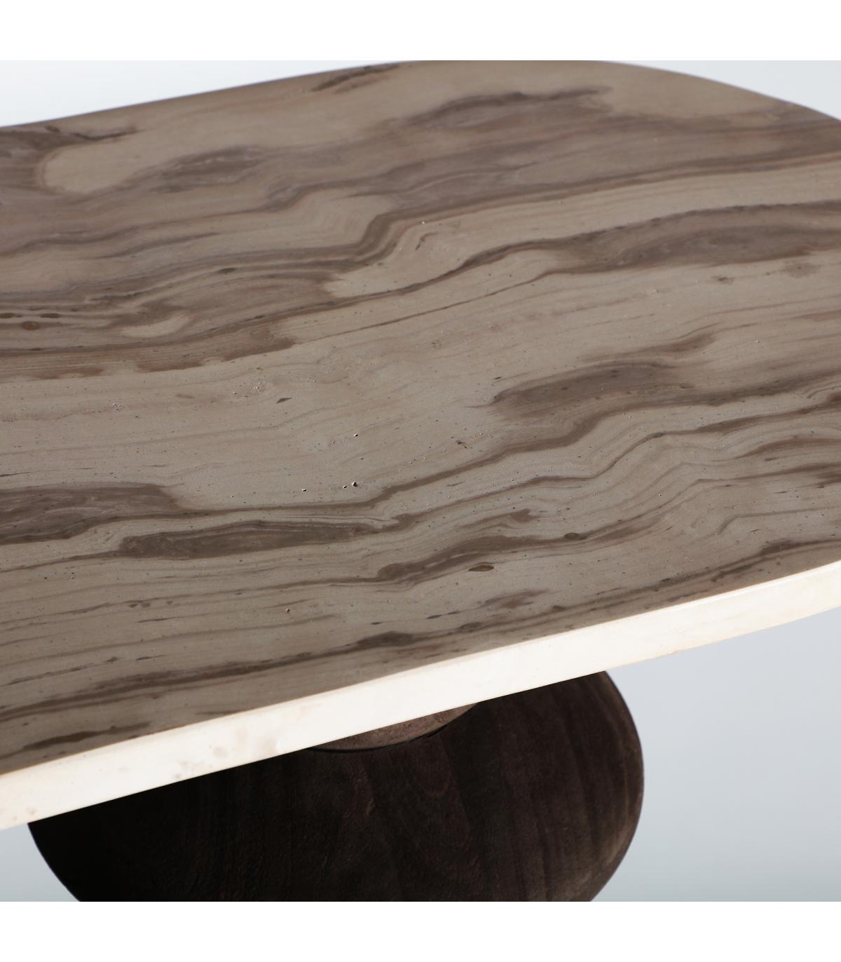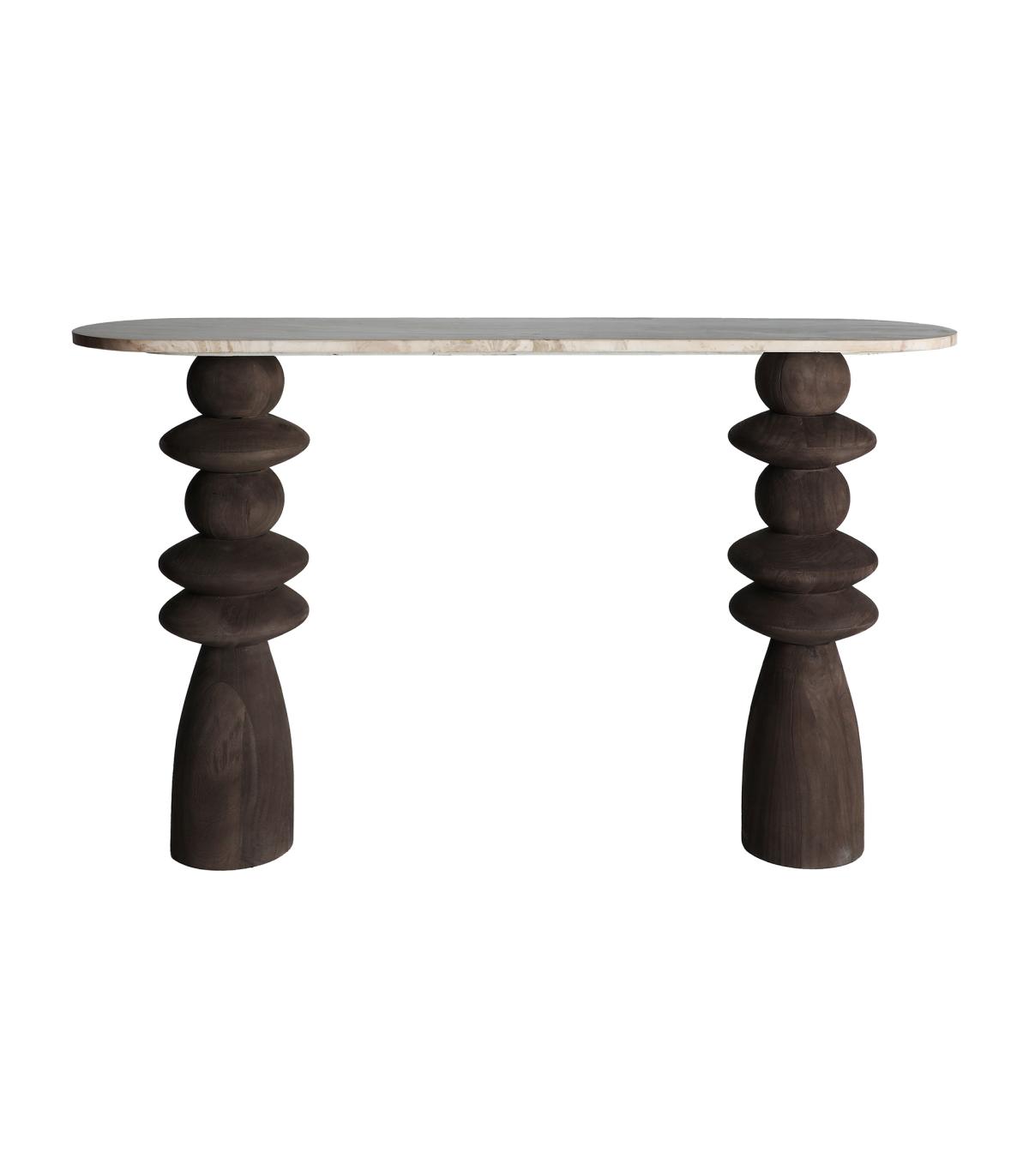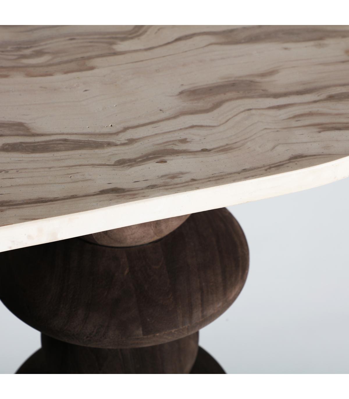 Consola oval vrads de estilo contemporáneo, fabricado en madera de mango en color marrón, combinado con mármol en color tonos en marrón.