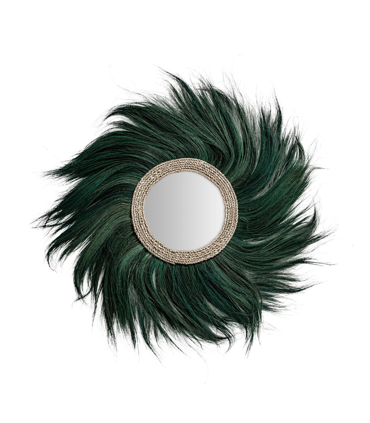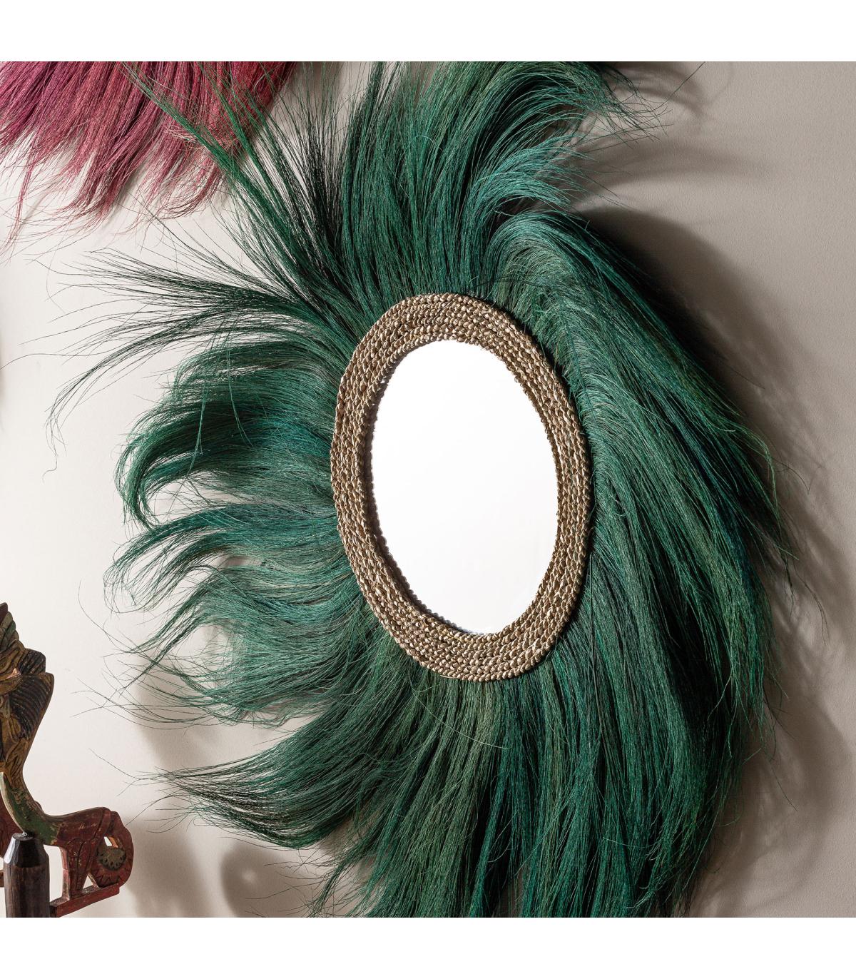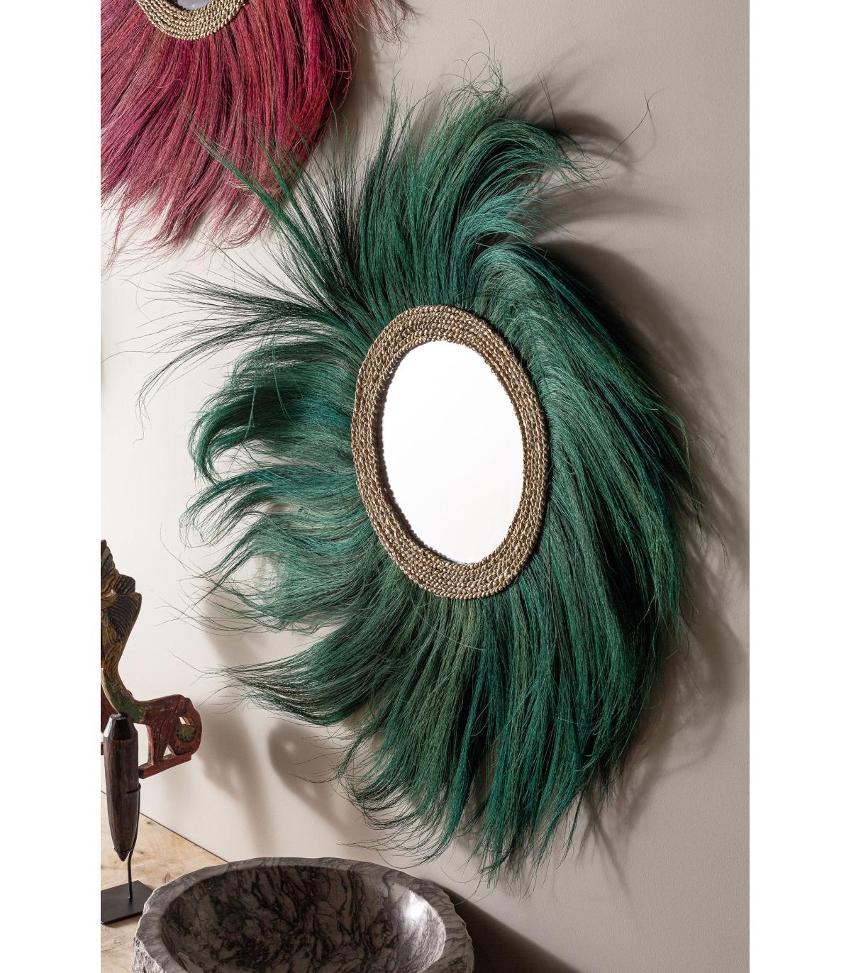 Espejo sinko de estilo étnico fabricado en fibra natural en color verde combinado con espejo.