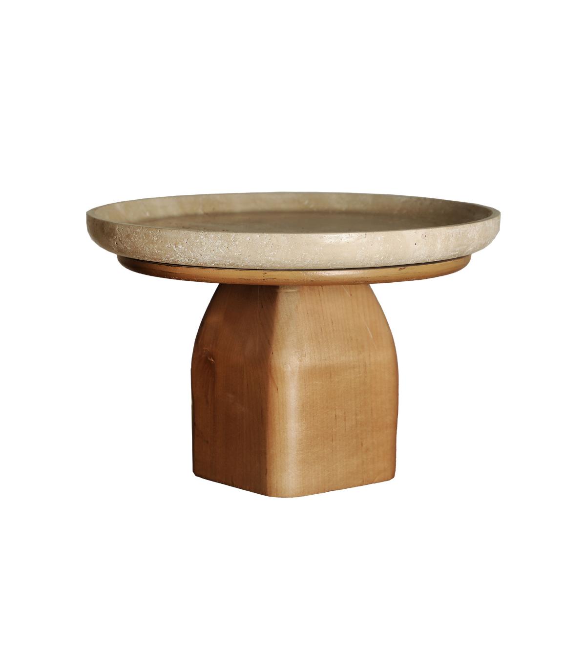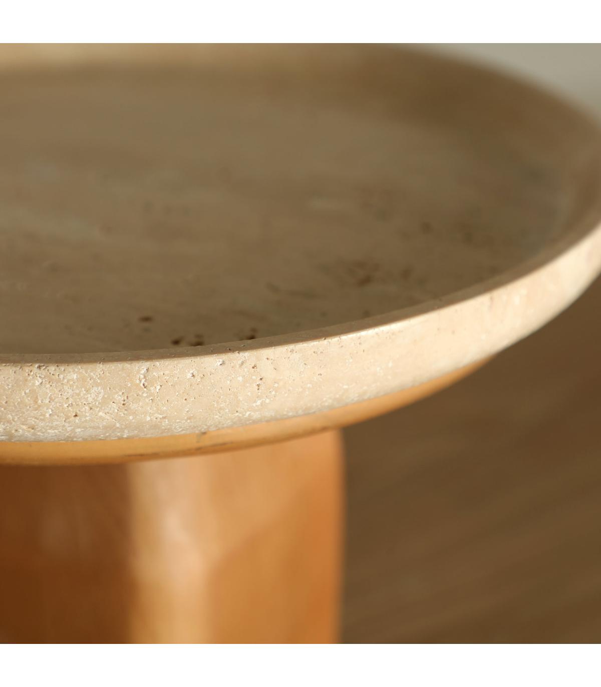 Vacia bolsillos redondo videix de estilo art deco, fabricado en mármol en color marrón, combinado con madera abedul en color beige.