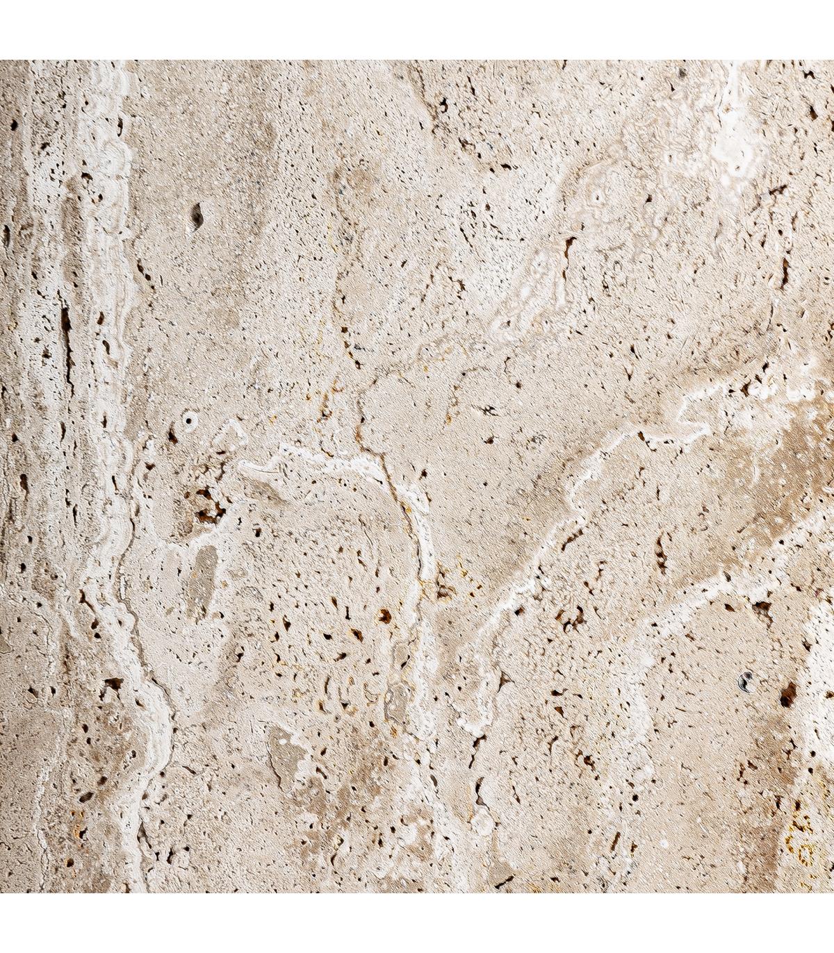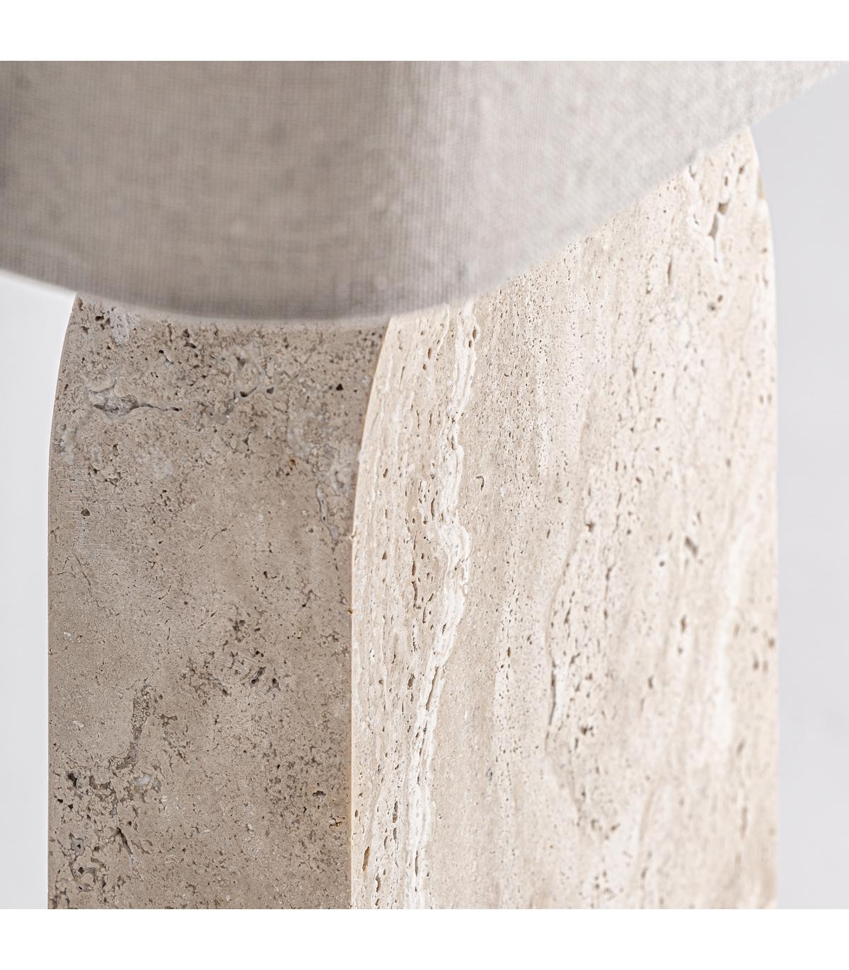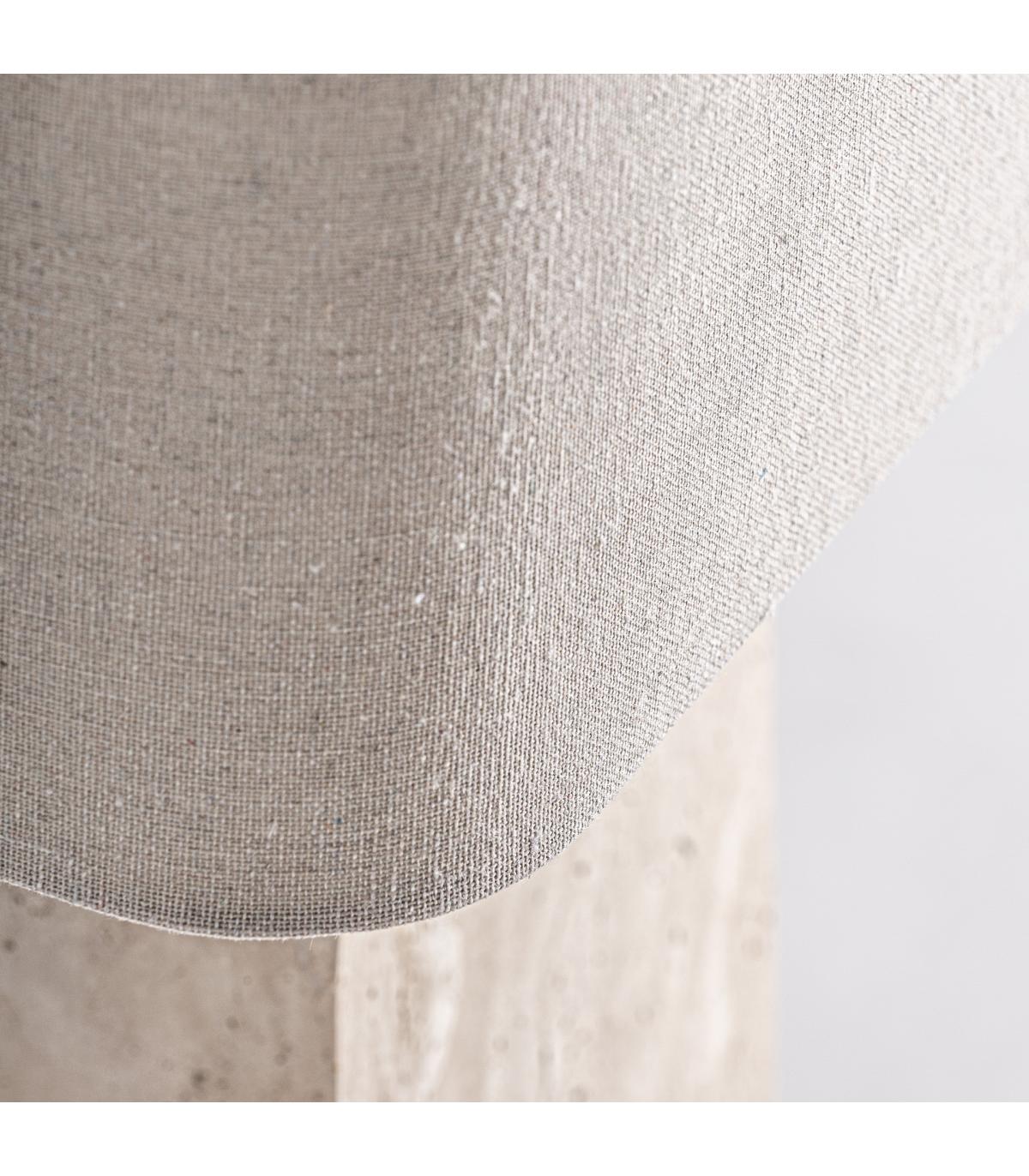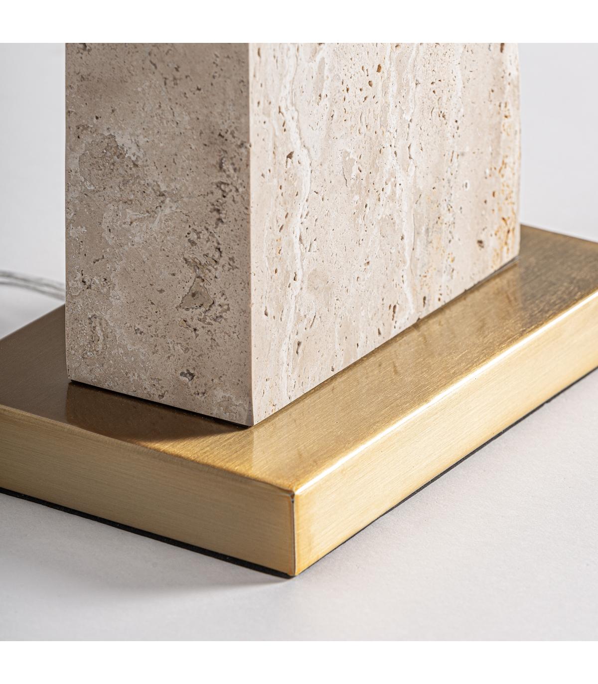 Lámpara de sobremesa de estilo art deco fabricado en travertino en color marfil combinado con hierro en color oro y lino en color blanco roto. Producto desmontable.