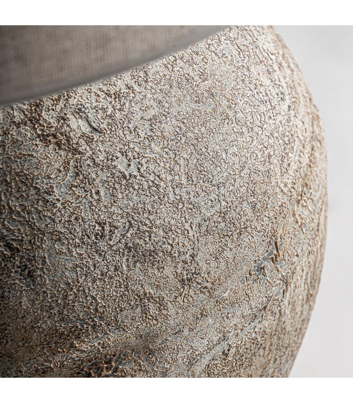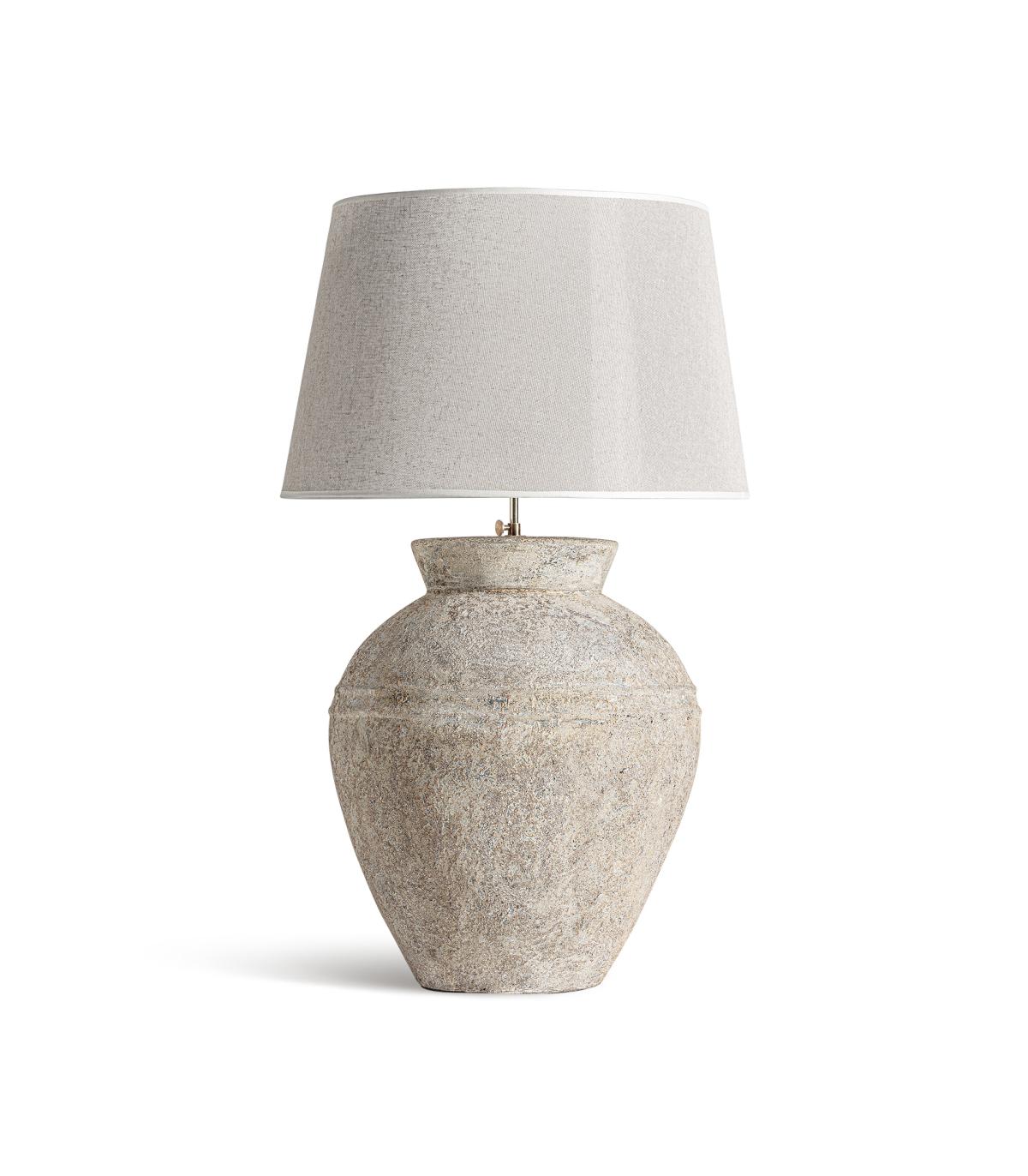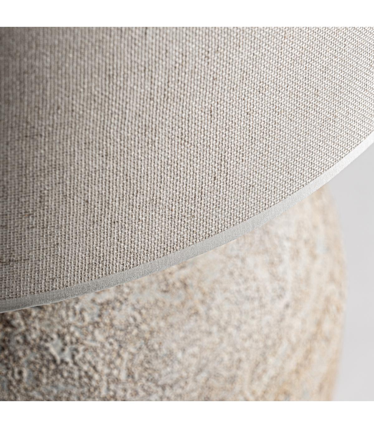 Lámpara de sobremesa de estilo provenzal fabricado en cerámica en color tonos claros con acabado envejecido combinado con algodón en color gris con acabado jaspeado.