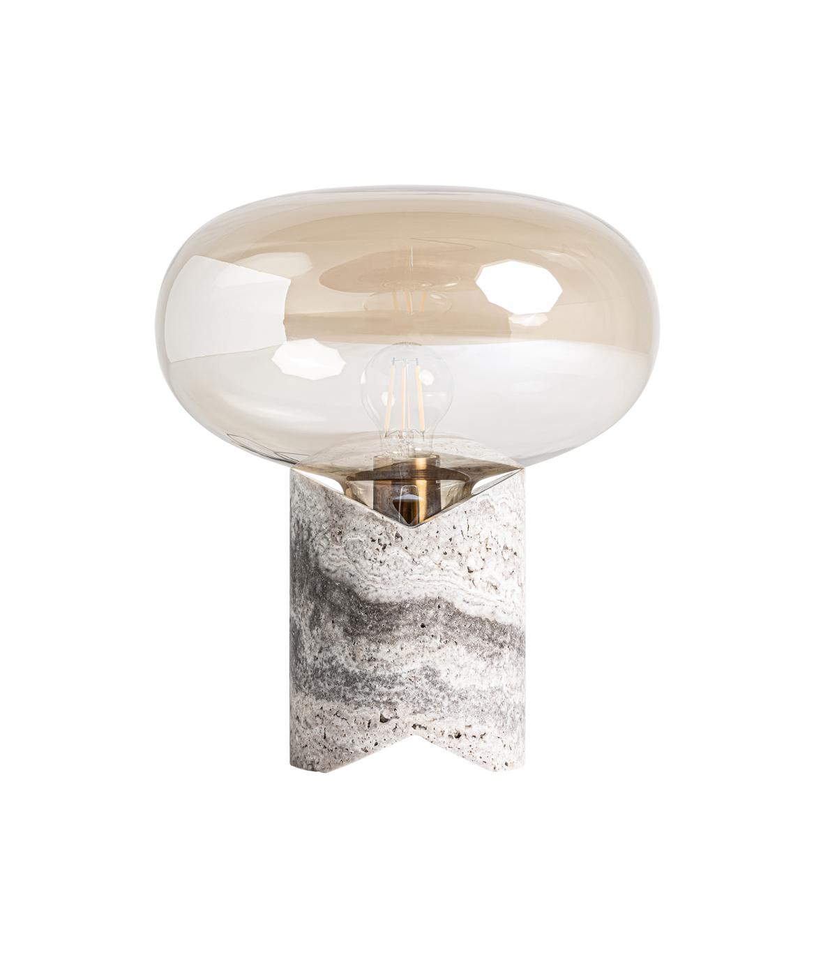 Lámpara de sobremesa Dumo de estilo art deco fabricado en mármol en color gris combinado con hierro en color oro y cristal en color transparente. Producto desmontable.