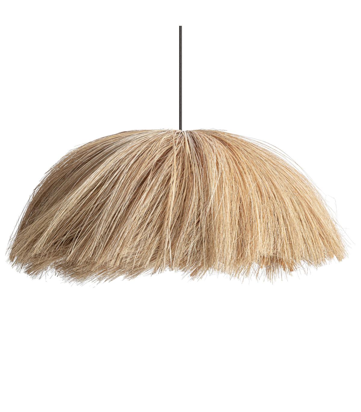 Lámpara de colgar fabricado en hierba marina en color marrón claro combinado con hierro en color negro.