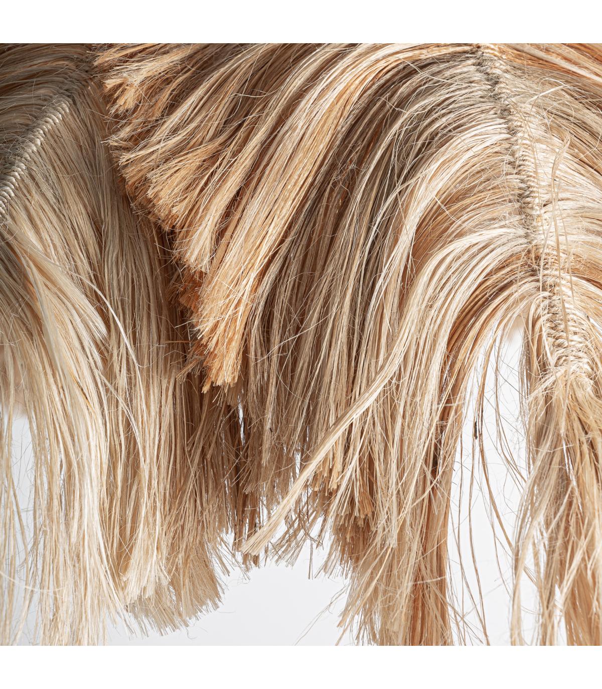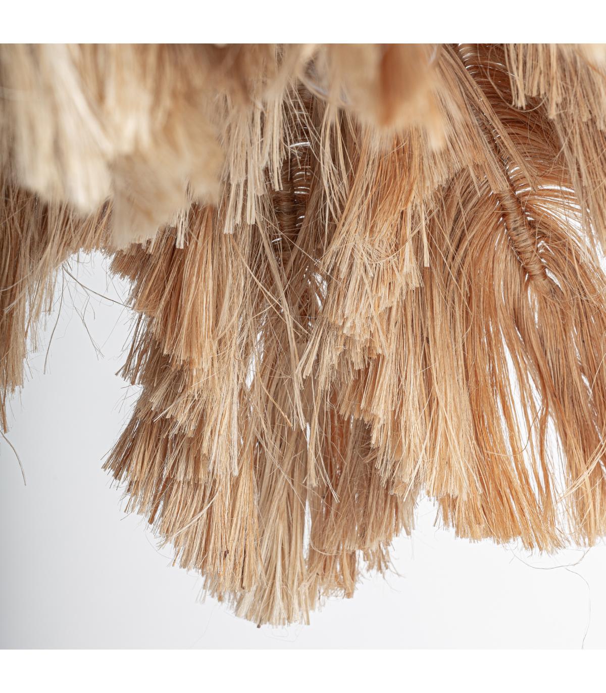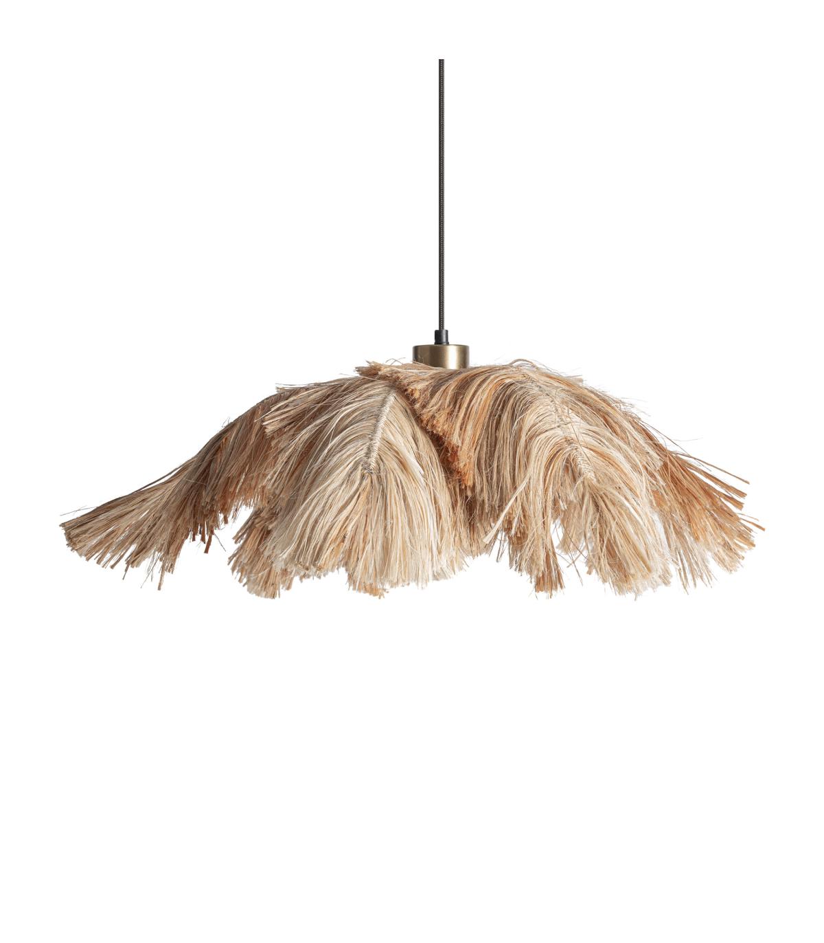 Lámpara de colgar fabricado en fibra natural en color beige combinado con hierro en color negro y acero en color dorado.