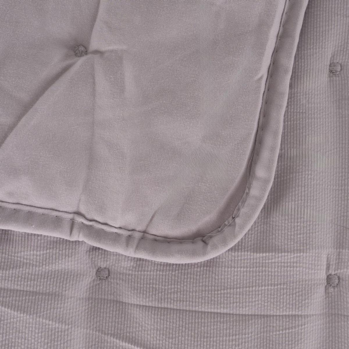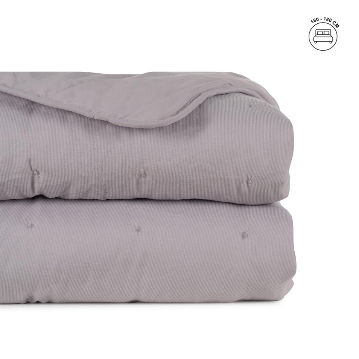 COLCHA GRIS POLIESTER DORMITORIO 270 X 280 CM Tejido parte delantera: 100% poliéster. Tejido parte trasera: microfibra prelavada. Gramaje: 130gr./m2. Relleno: Poliéster Instrucciones de lavado: - lavar temperatura máx. 30ºC. - no utilizar lejía. - no planchar. - no utilizar secadora.