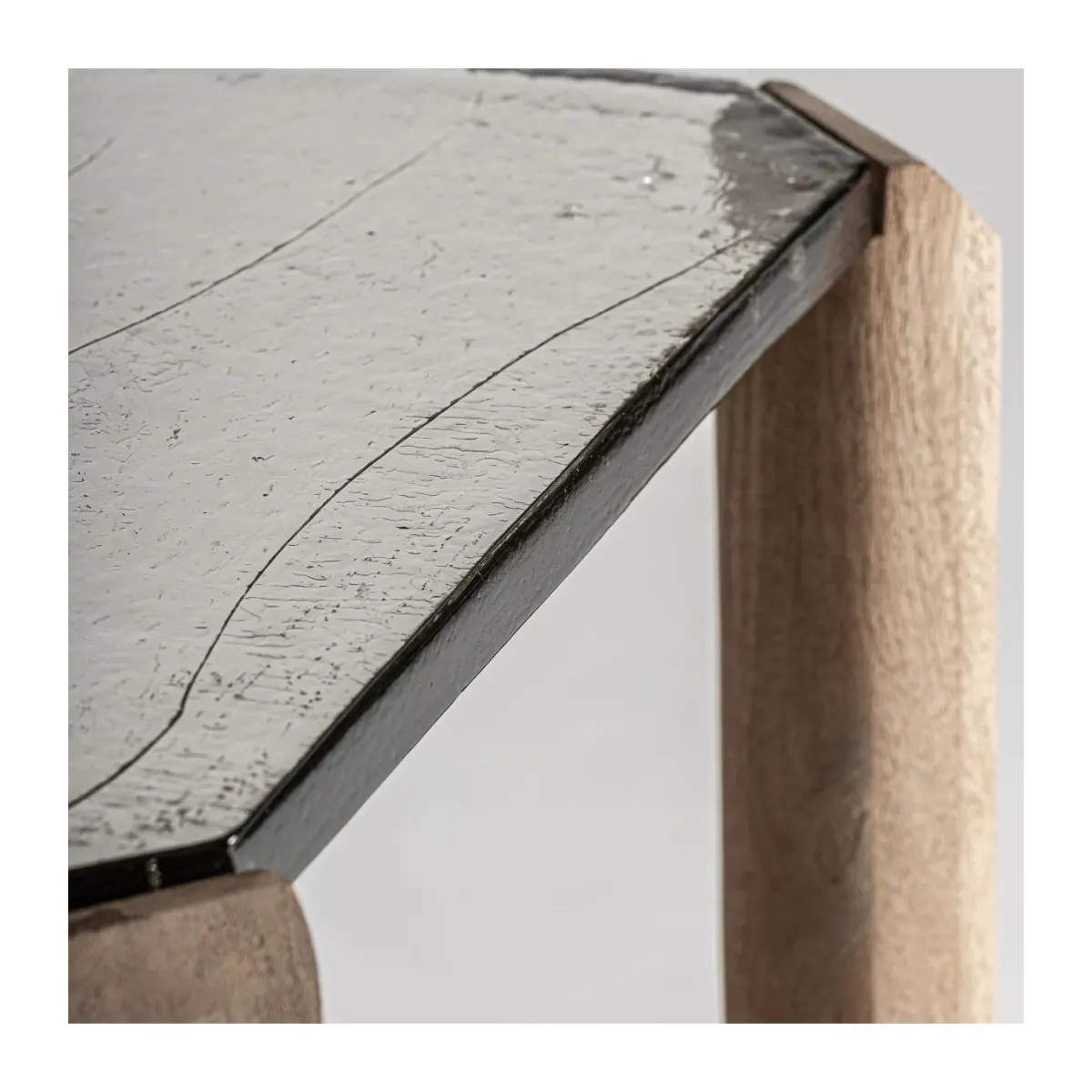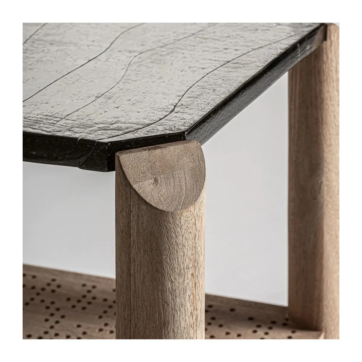Mesa auxiliar jacquard de estilo contemporáneo. Fabricado en madera de mango en color marrón claro combinado con vidrio en color transparente. Producto desmontable.