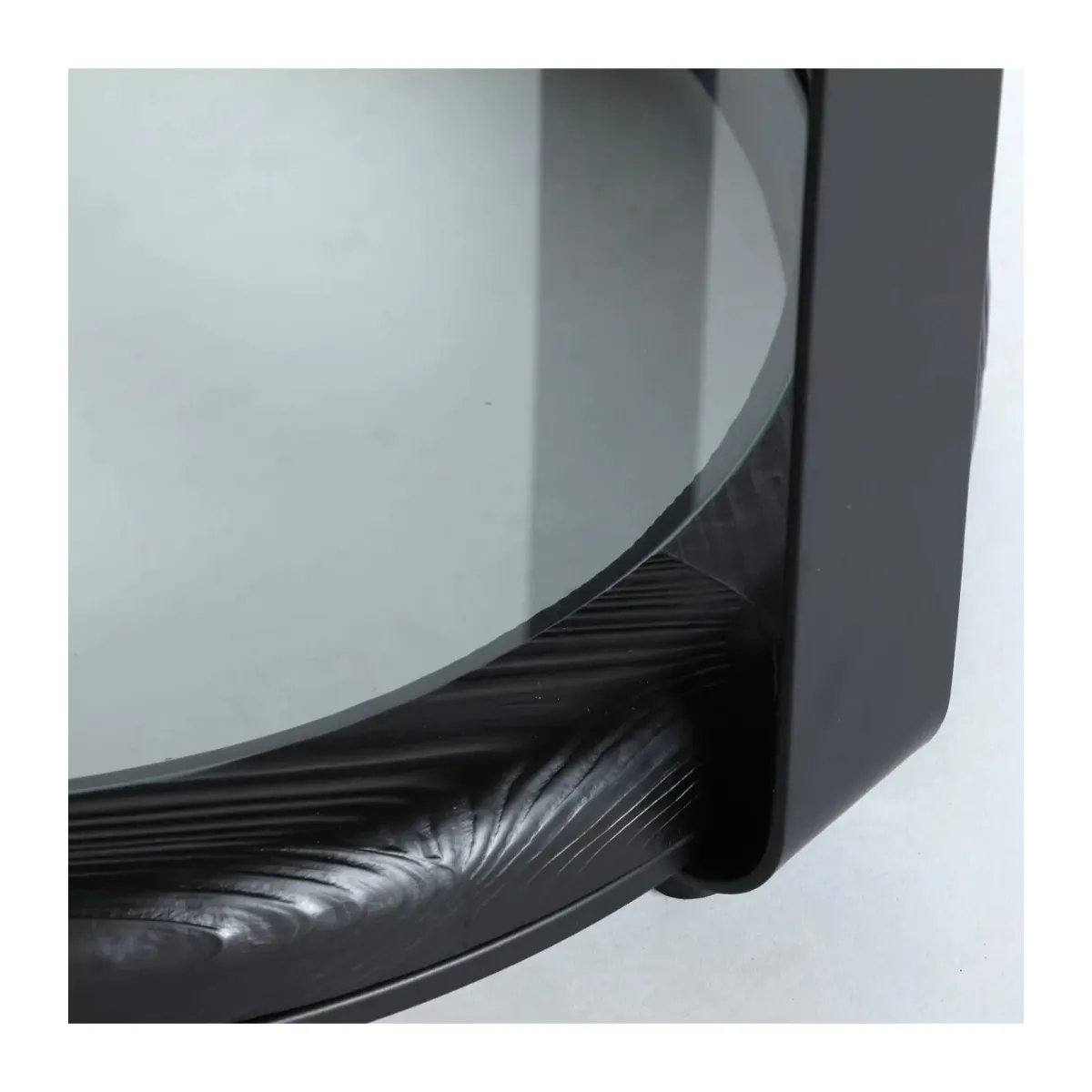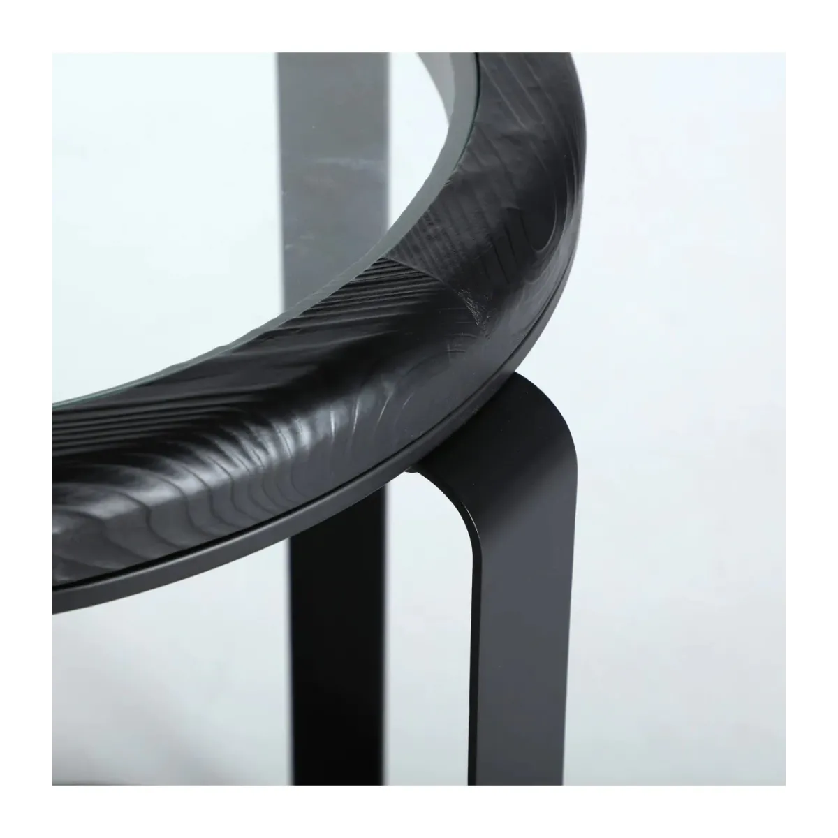 Mesa auxiliar Kilde de estilo minimalista, fabricado en madera de abeto en color negro, combinado con cristal en color transparente con acabado templado y hierro en color negro.