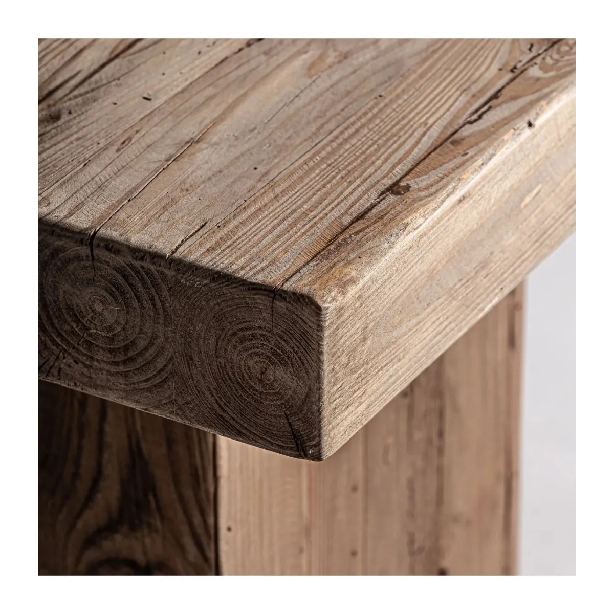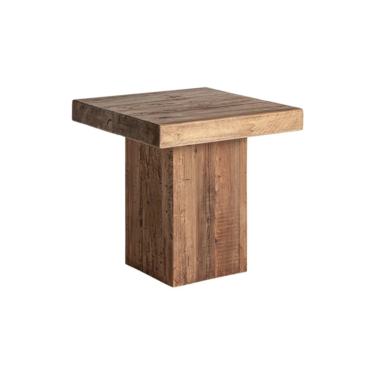 Mesa auxiliar breive de estilo rústico fabricado en madera de pino reciclado en color marrón con acabado envejecido.