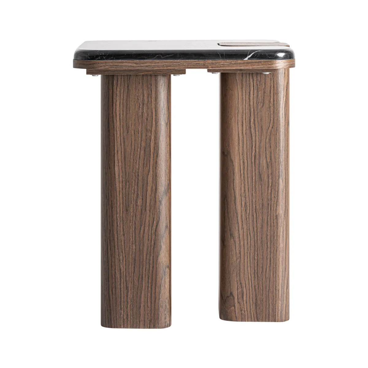 Mesa auxiliar Atlas de estilo contemporáneo, fabricado en madera dm en color marrón, combinado con mármol en color negro y chapa de madera. Producto desmontable.