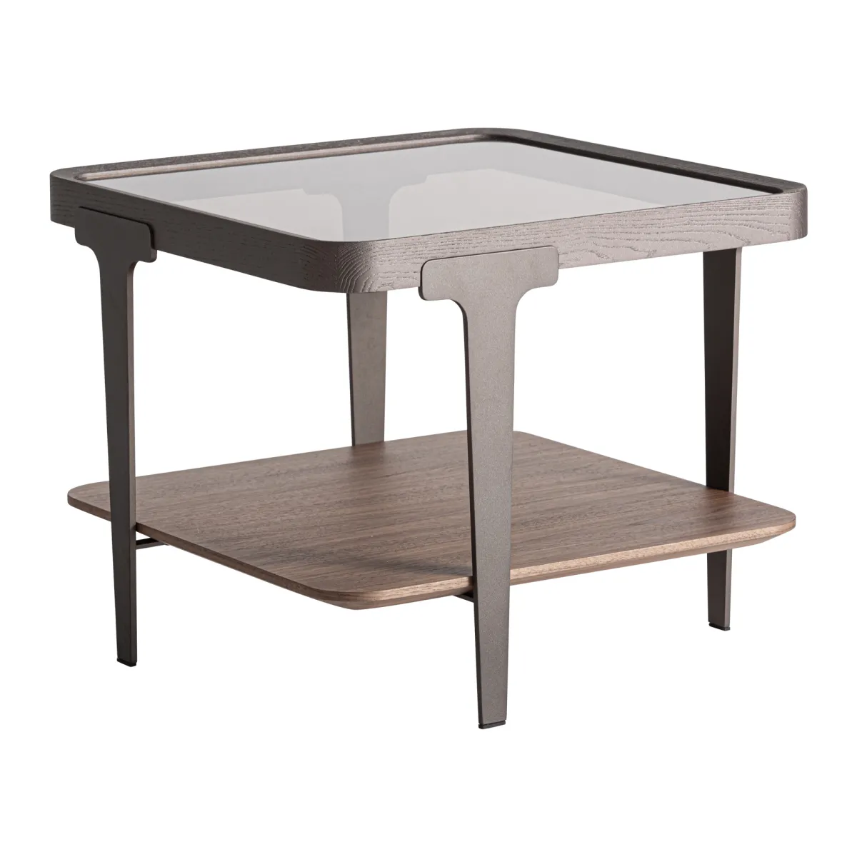 Mesa auxiliar Gehofen de estilo contemporáneo fabricado en madera de fresno en color marrón combinado con cristal en color gris con acabado ahumado y hierro en color negro. Producto desmontable.