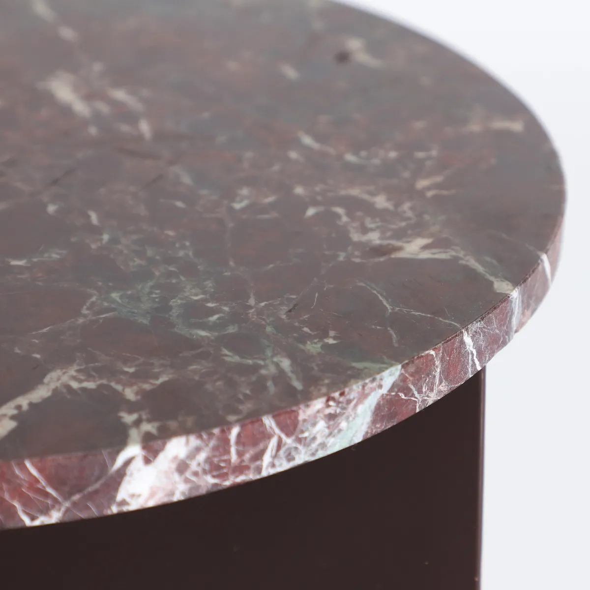 Mesa auxiliar Tilo de estilo contemporáneo, fabricado en hierro en color chocolate con acabado brillo, combinado con mármol sintético en color burdeos con acabado veteado.