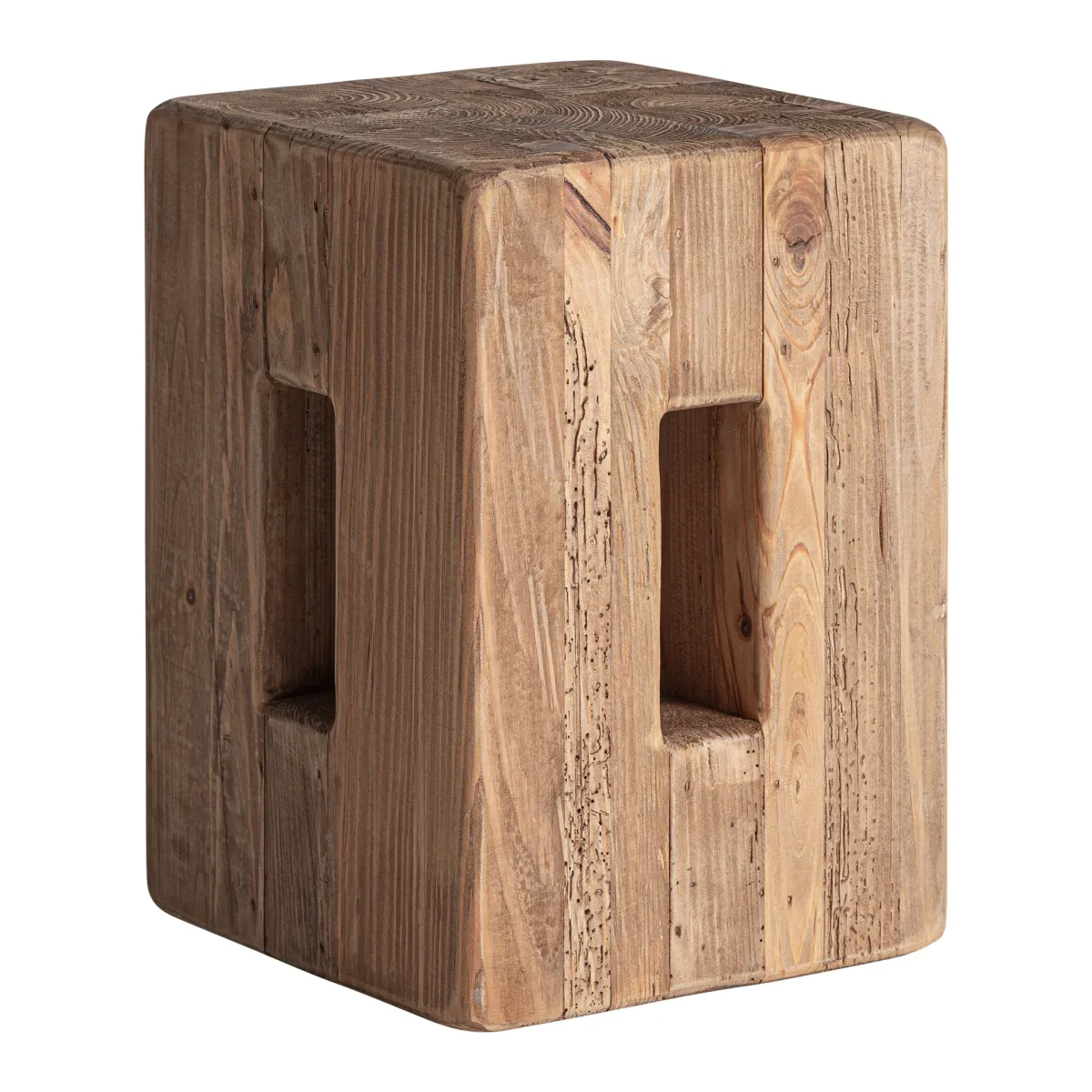 Taburete Celis de estilo étnico fabricado en madera de pino reciclado.