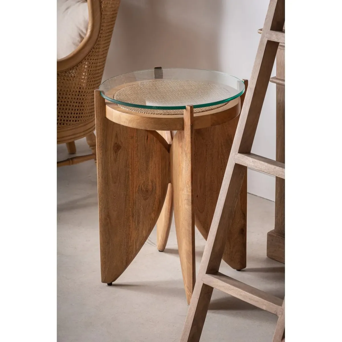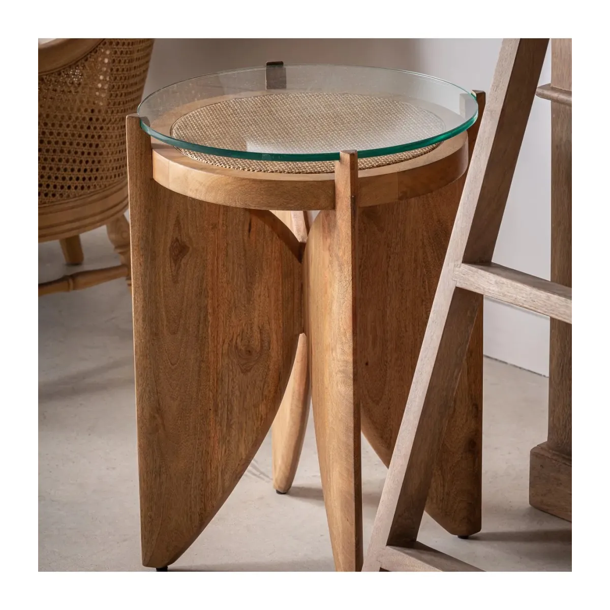 Mesa auxiliar riesa, en color natural, de estilo colonial. Fabricado en madera de mango, combinado con vidrio y ratán.