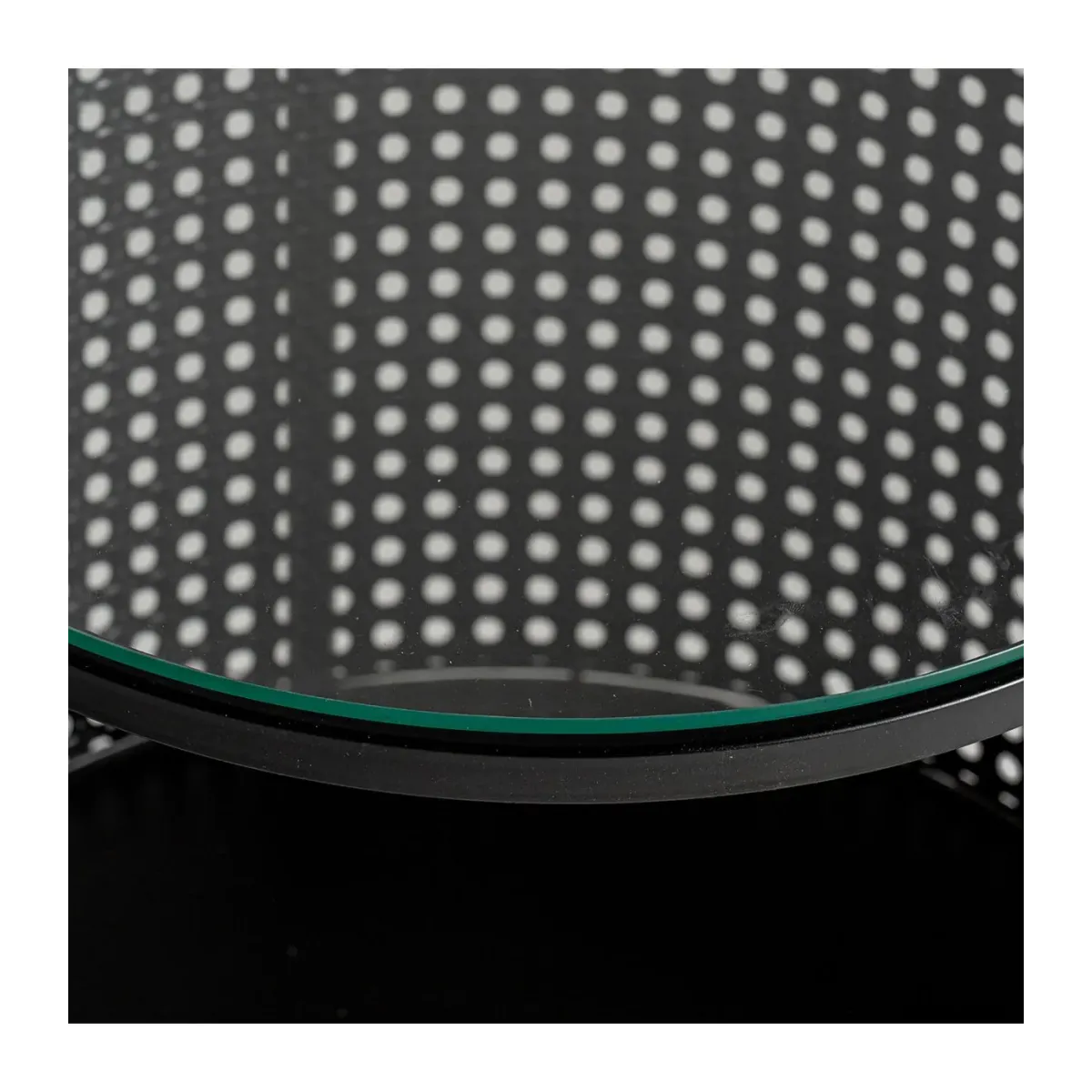 Mesa auxiliar fussen, en color negro/oro, de estilo art deco. Fabricado en hierro, combinado con vidrio. Producto desmontable.