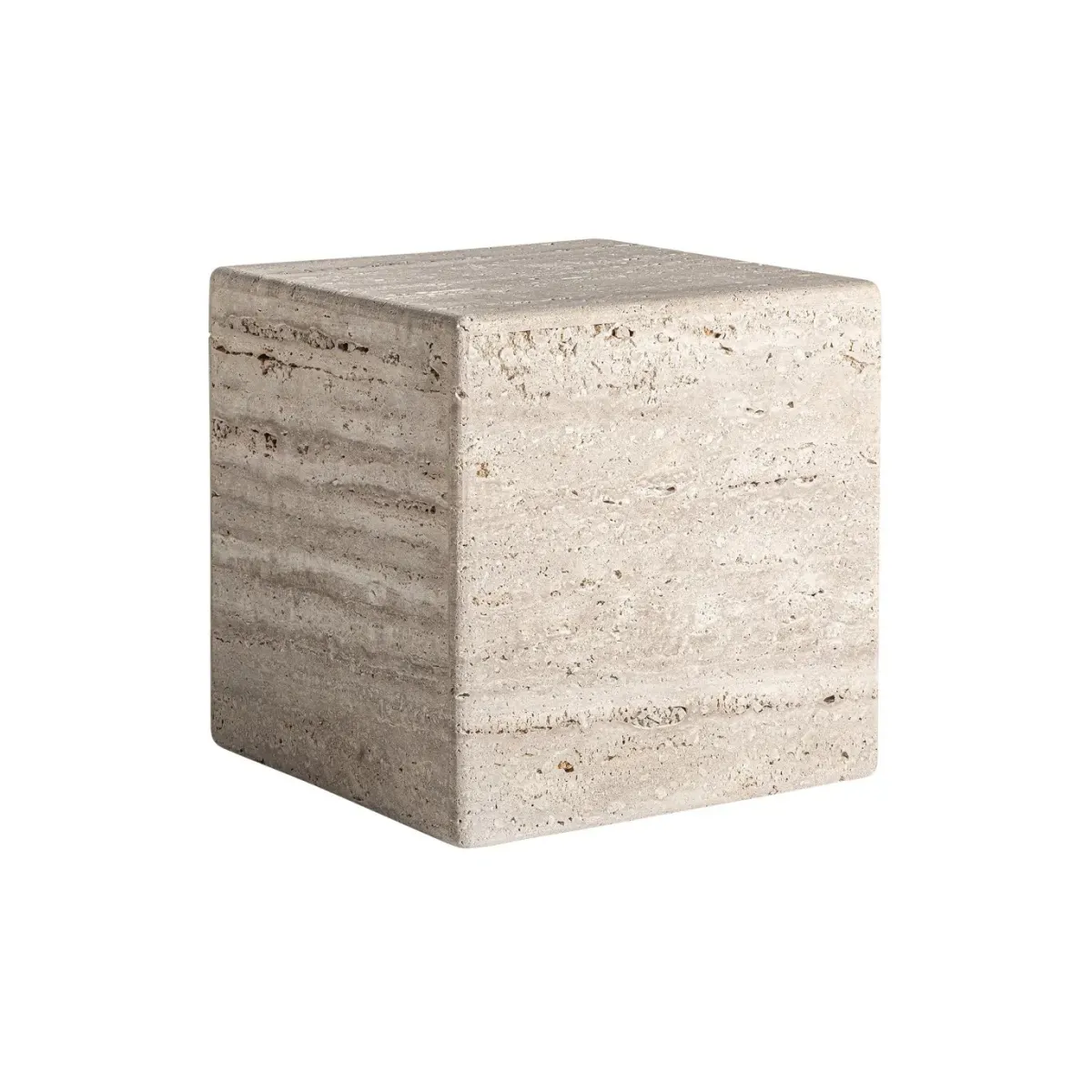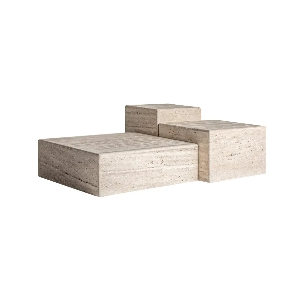 Mesa de centro de estilo art deco fabricado en travertino en color beige.