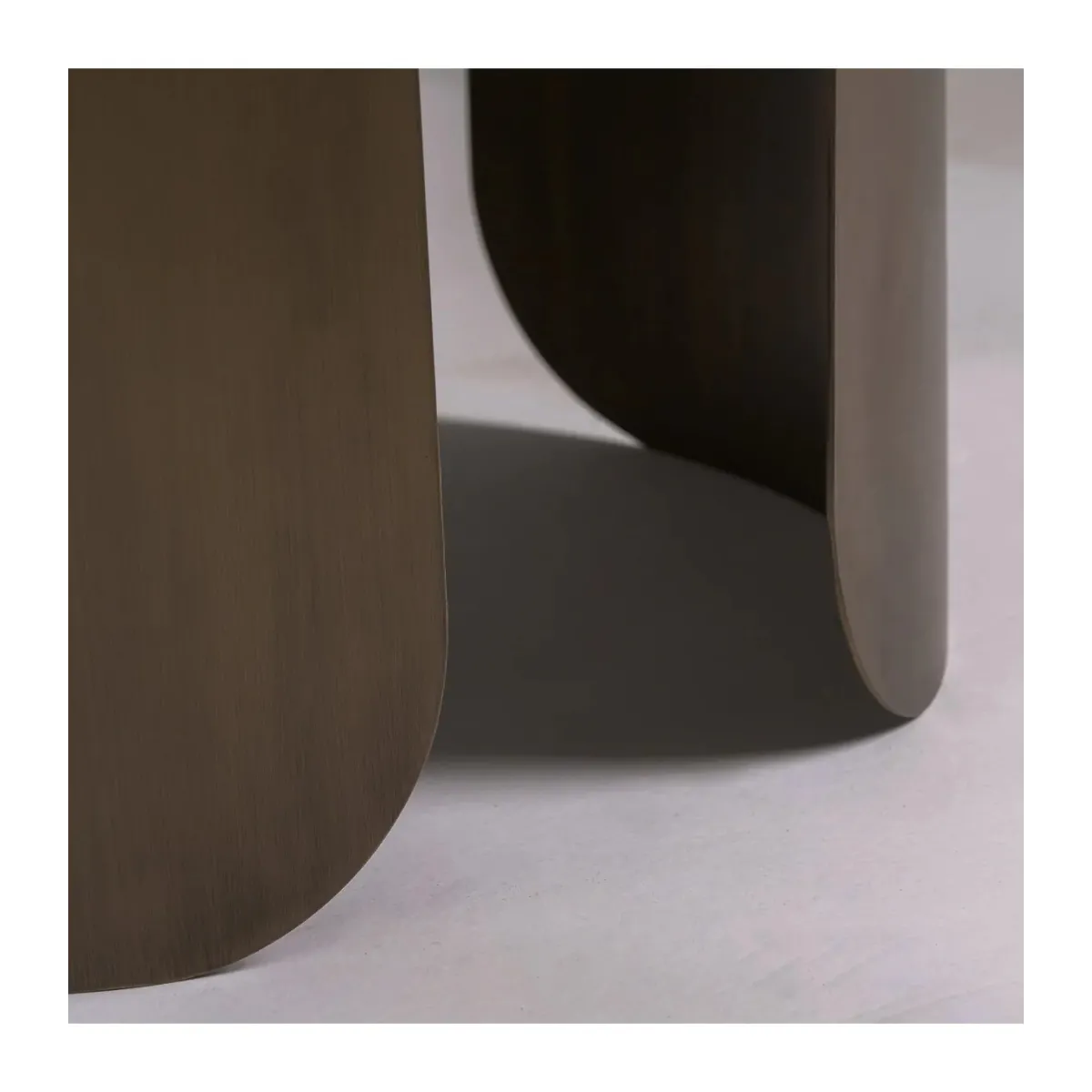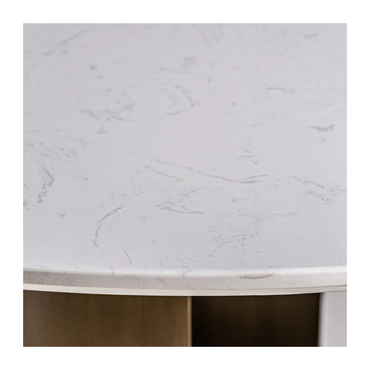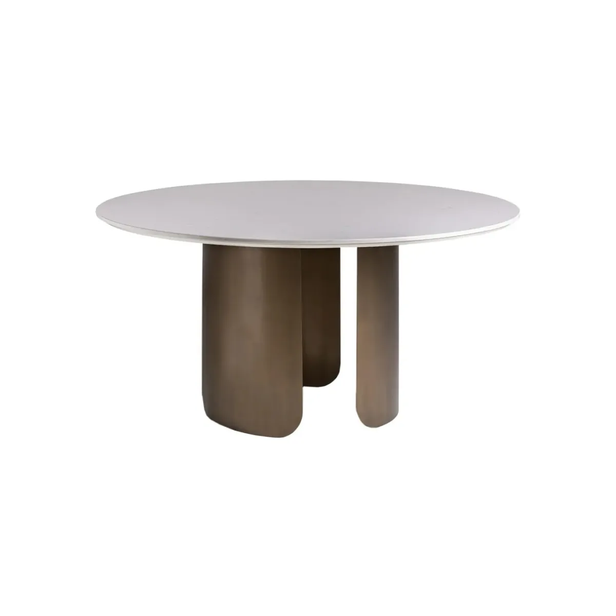 Mesa comedor vimperk de estilo art deco fabricado en porcelánico en color blanco roto combinado con acero en color marrón. Producto desmontable.