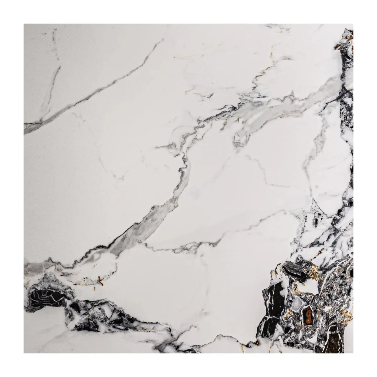 Mesa comedor astach de estilo art deco fabricado en porcelánico en color blanco combinado con acero en color oro. Producto desmontable.
