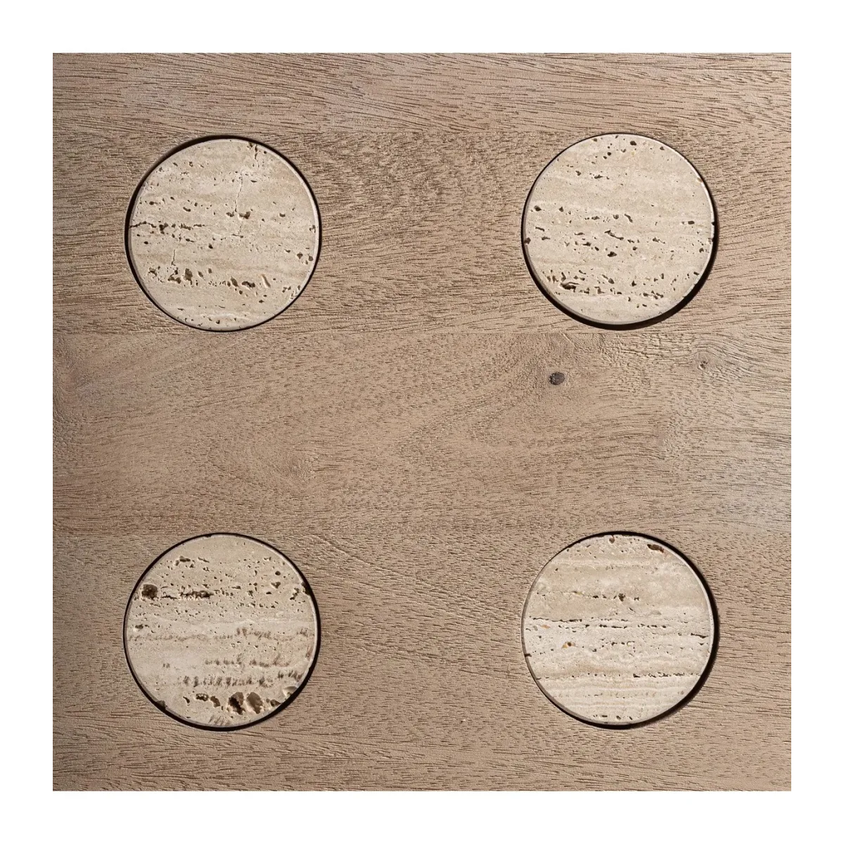 Mesa comedor jacquard de estilo contemporáneo. Fabricado en madera de mango en color marrón claro combinado con travertino en color marrón. Producto desmontable.