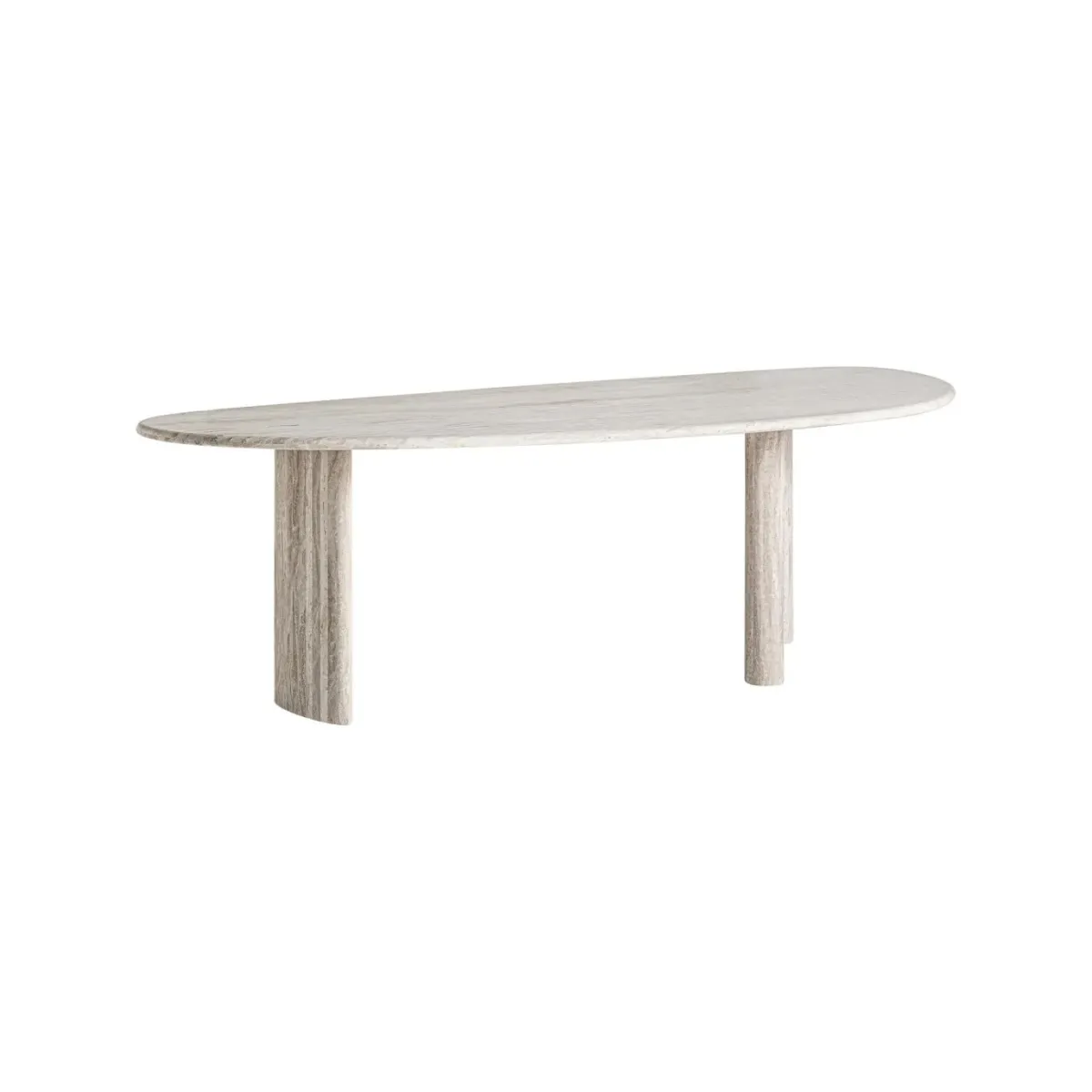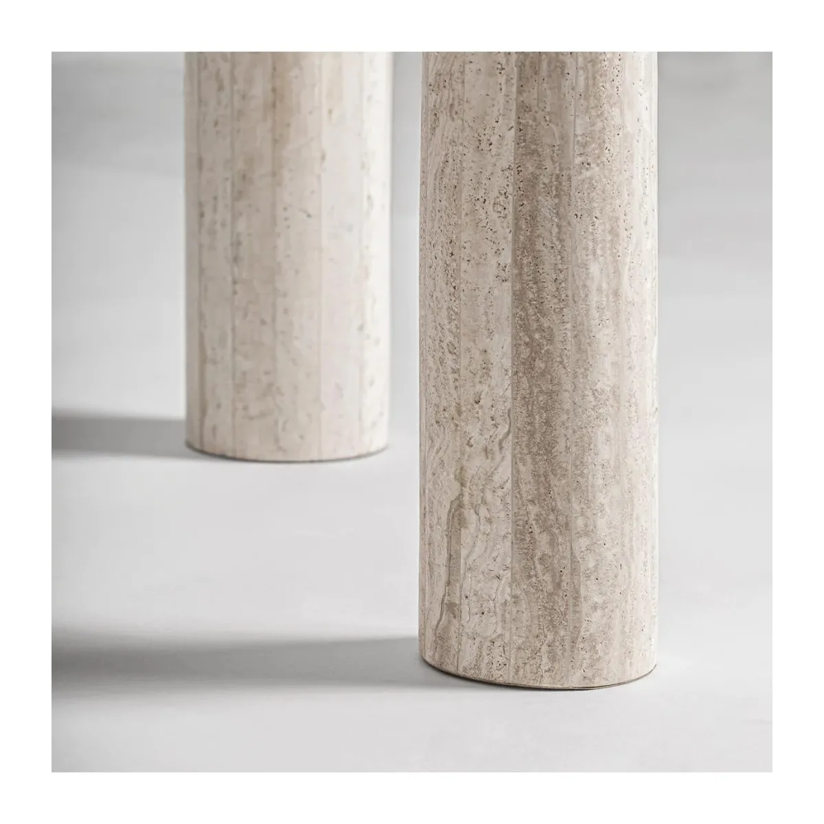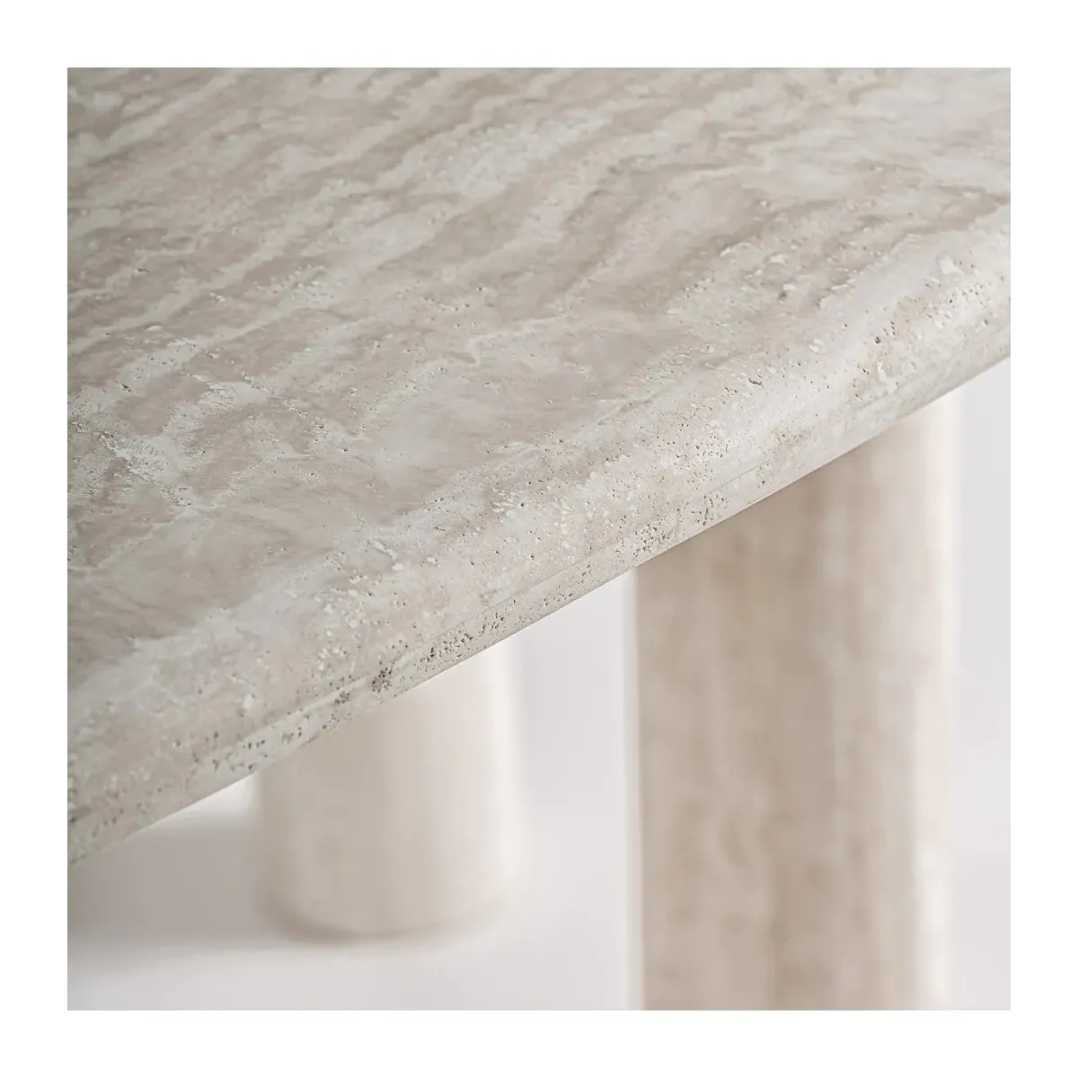 Mesa comedor Thiennes de estilo art deco fabricado en travertino en color blanco roto. Producto desmontable.