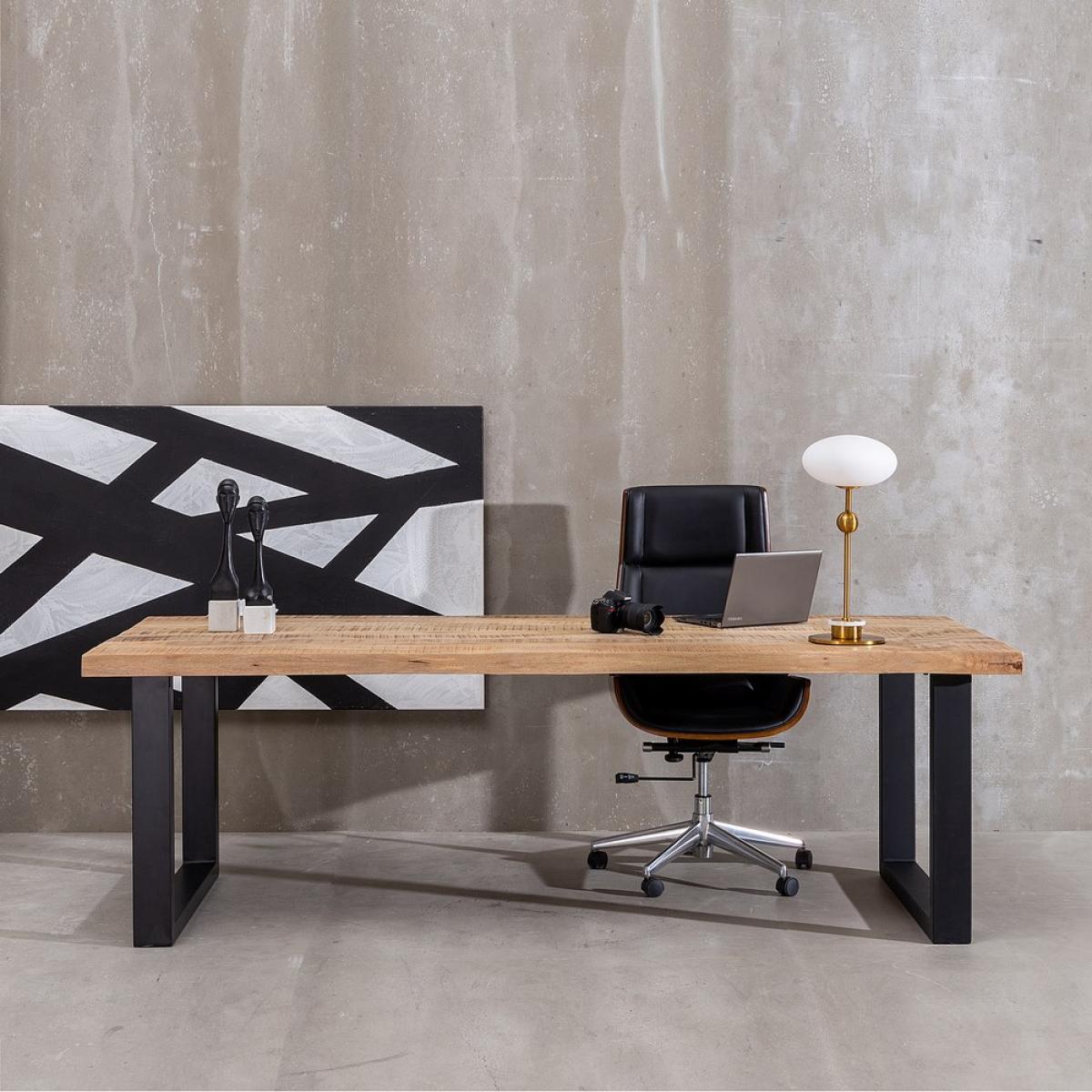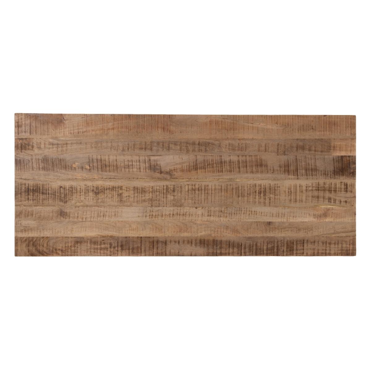 MESA COMEDOR NATURAL-NEGRO 240 X 100 X 76 CM Material: madera de mango. Patas de hierro de 5x10cm. La superficie del sobre puede no ser totalmente lisa debido a su fabricación manual con listones de madera maciza. Grueso tablero: 6cm.