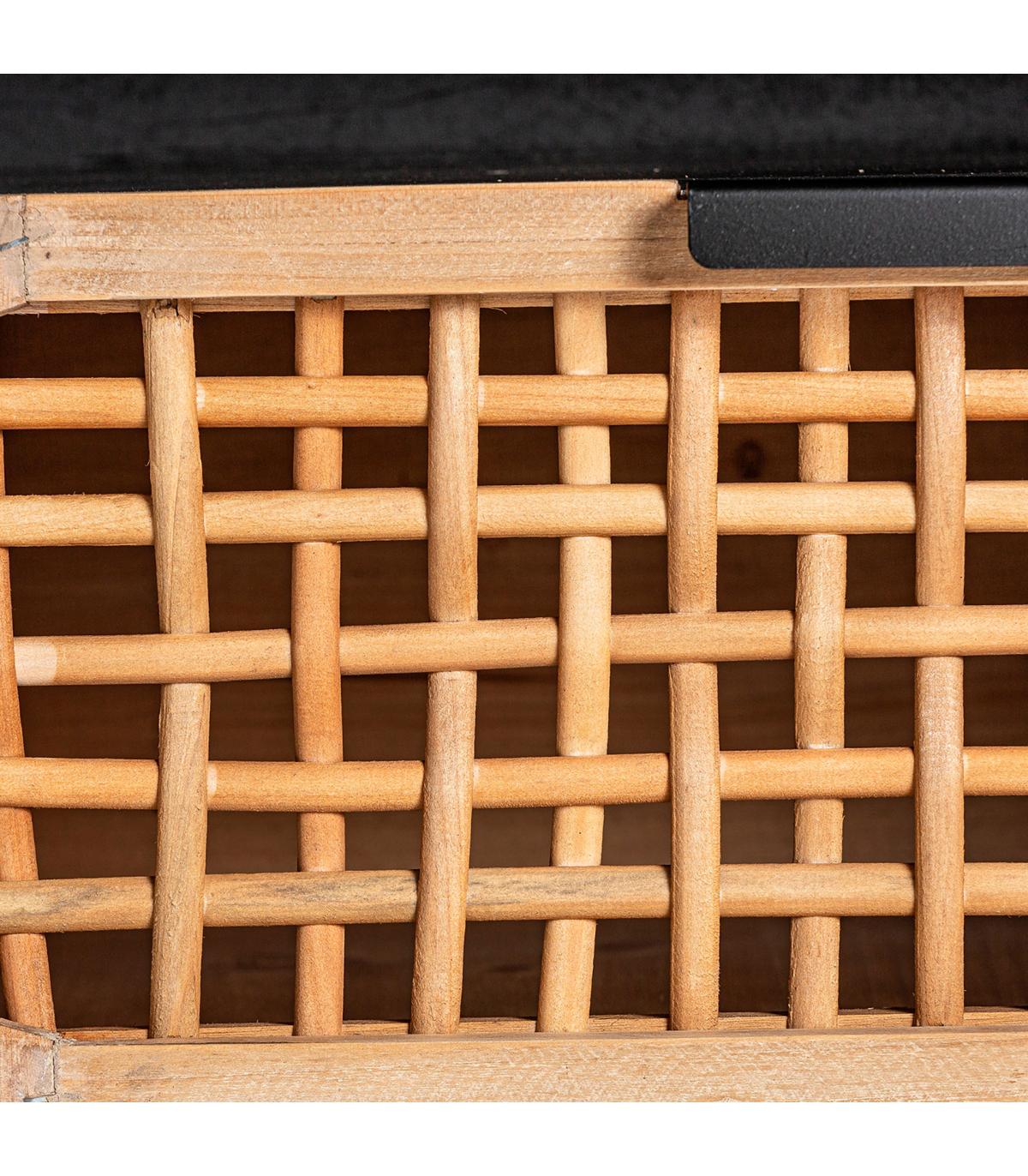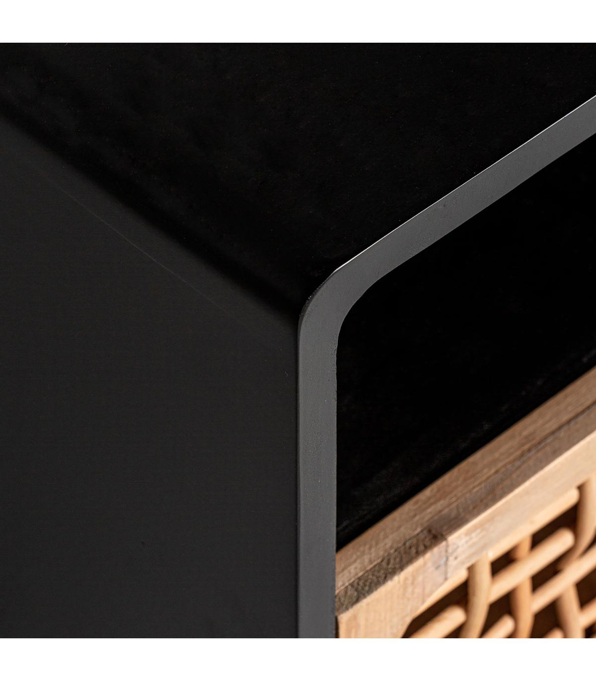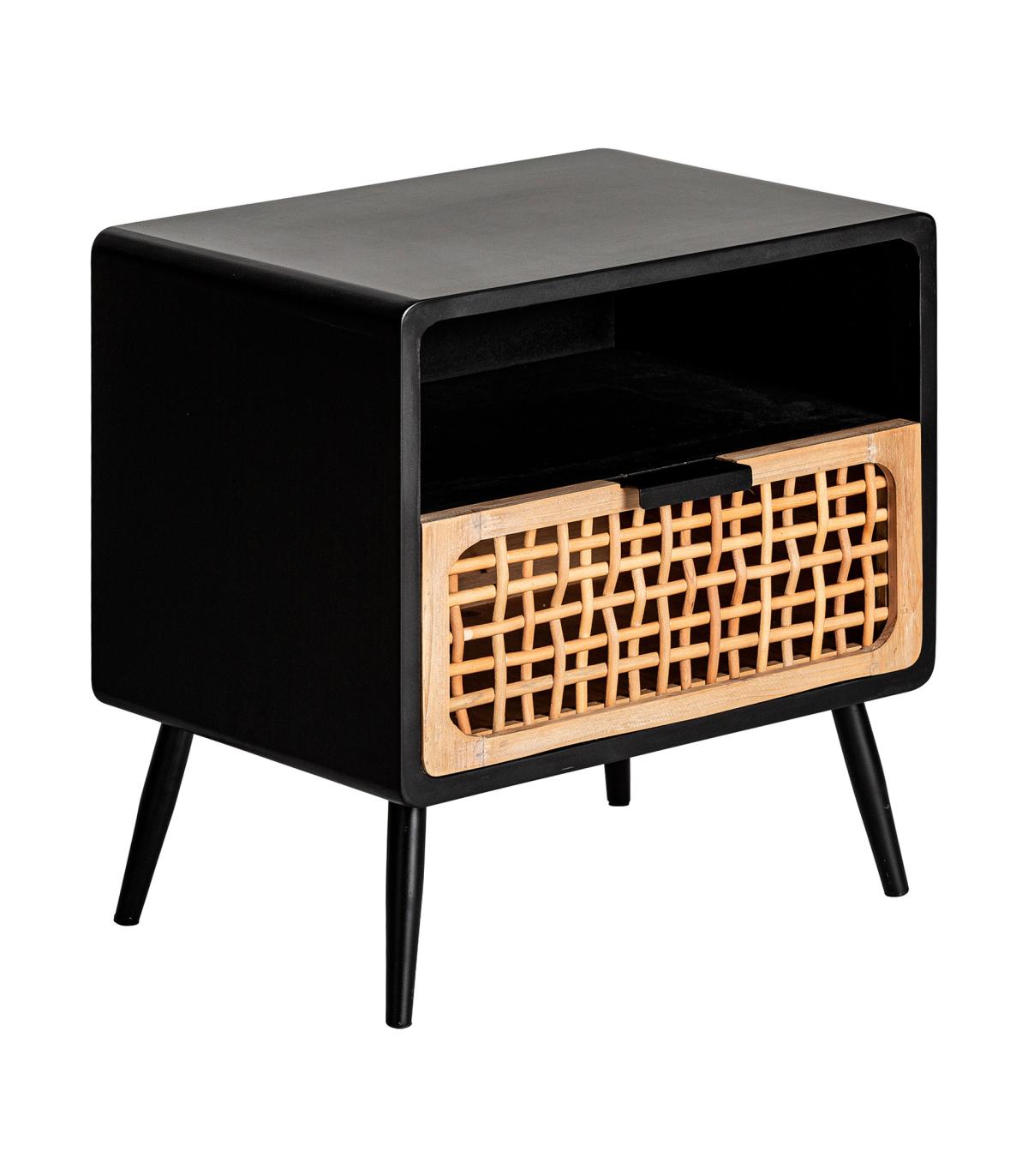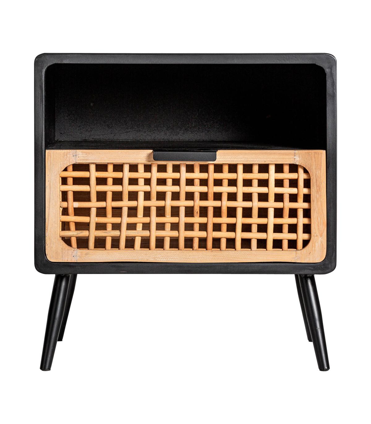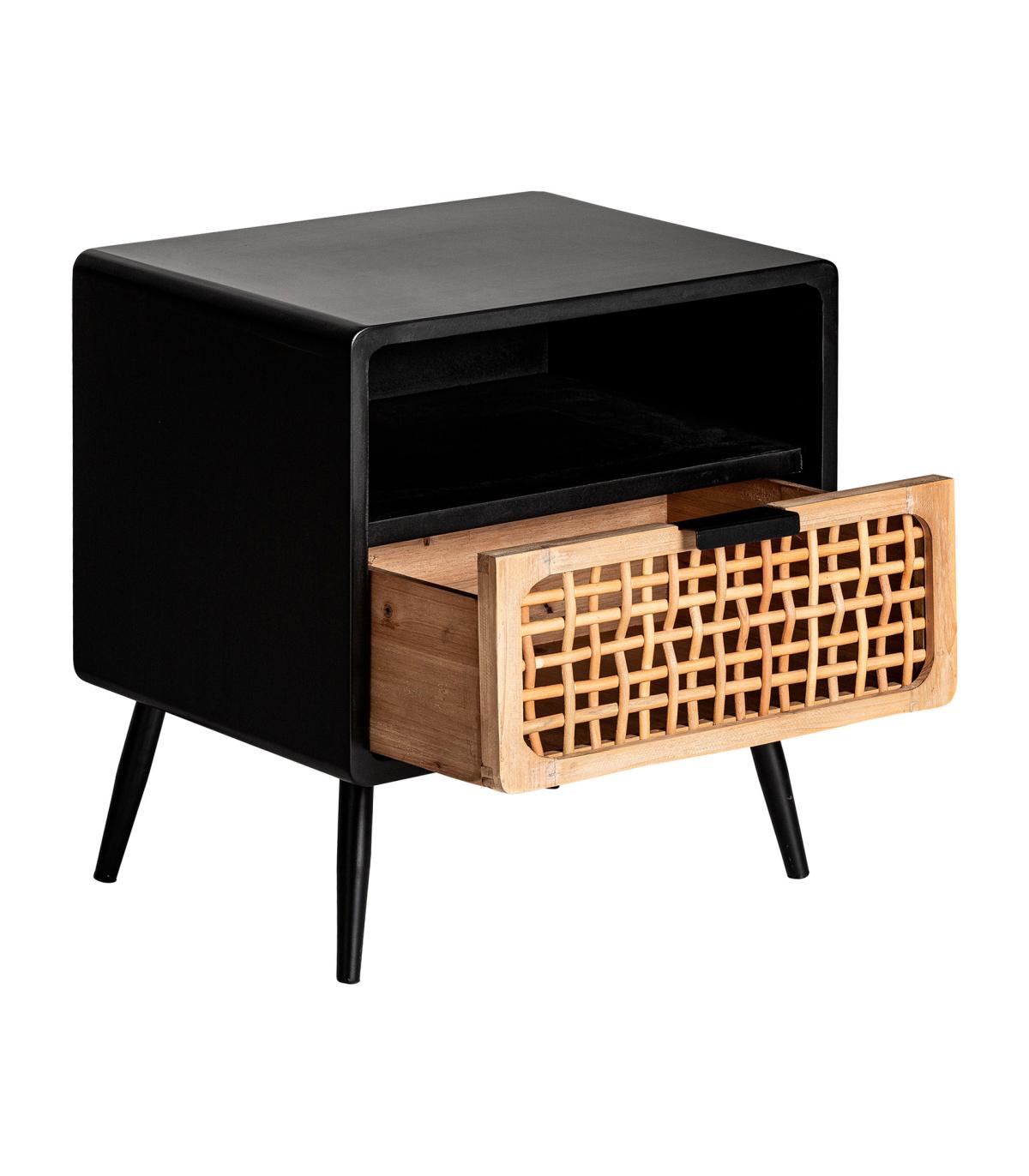 Mesita de noche cuadrada solden de estilo contemporáneo, fabricado en madera de abeto en color marrón claro, combinado con madera dm y hierro en color negro. Producto desmontable.