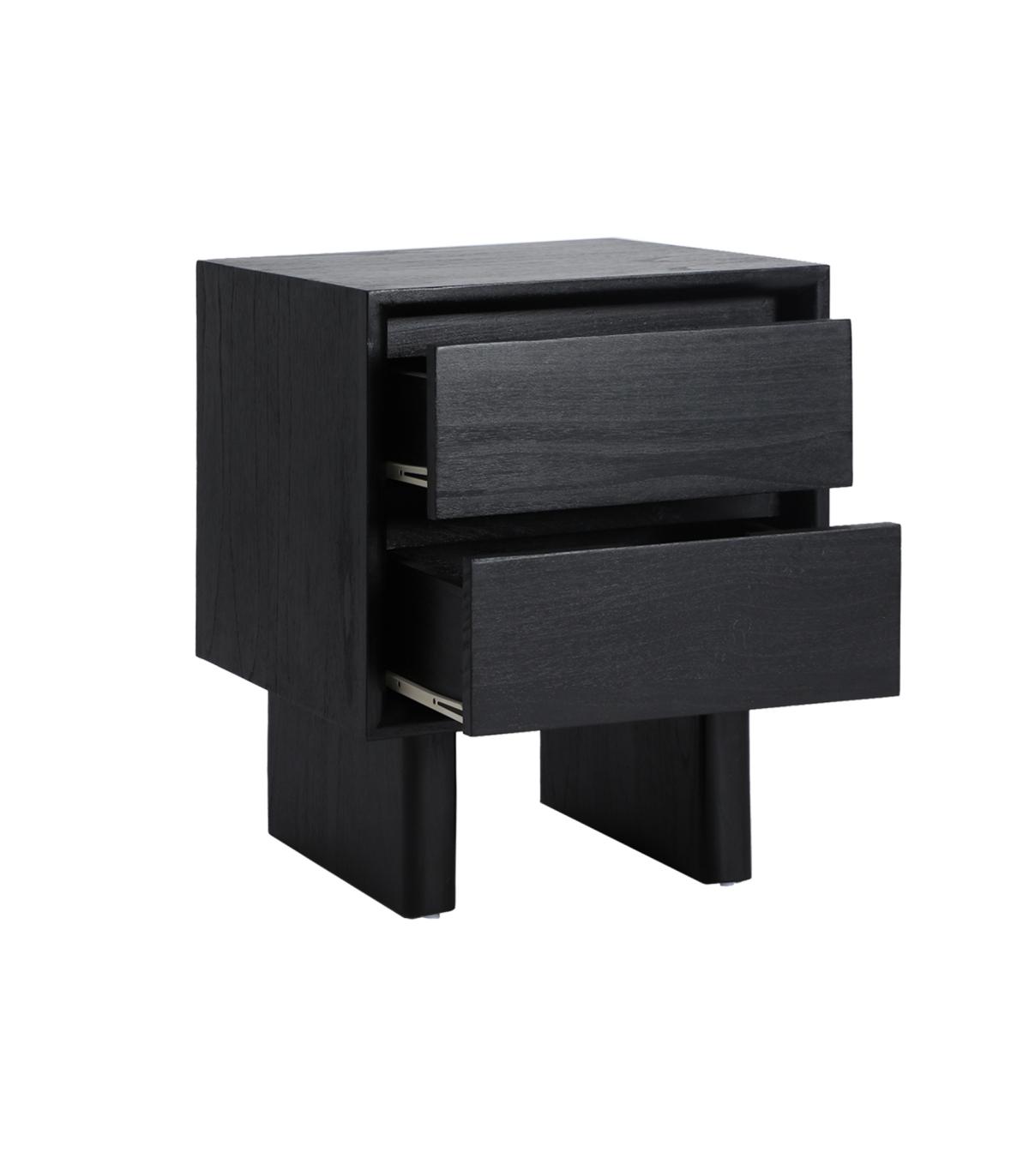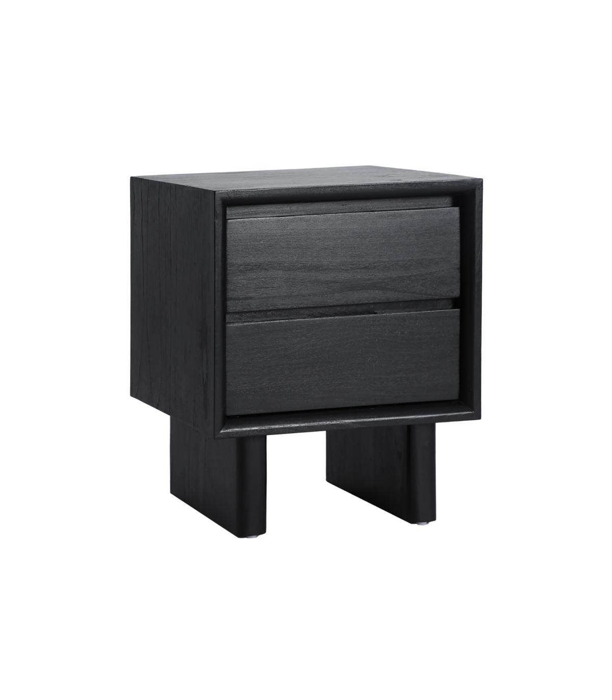 Mesita de noche Demmin de estilo contemporáneo, fabricado en madera mindi en color negro. Producto desmontable.
