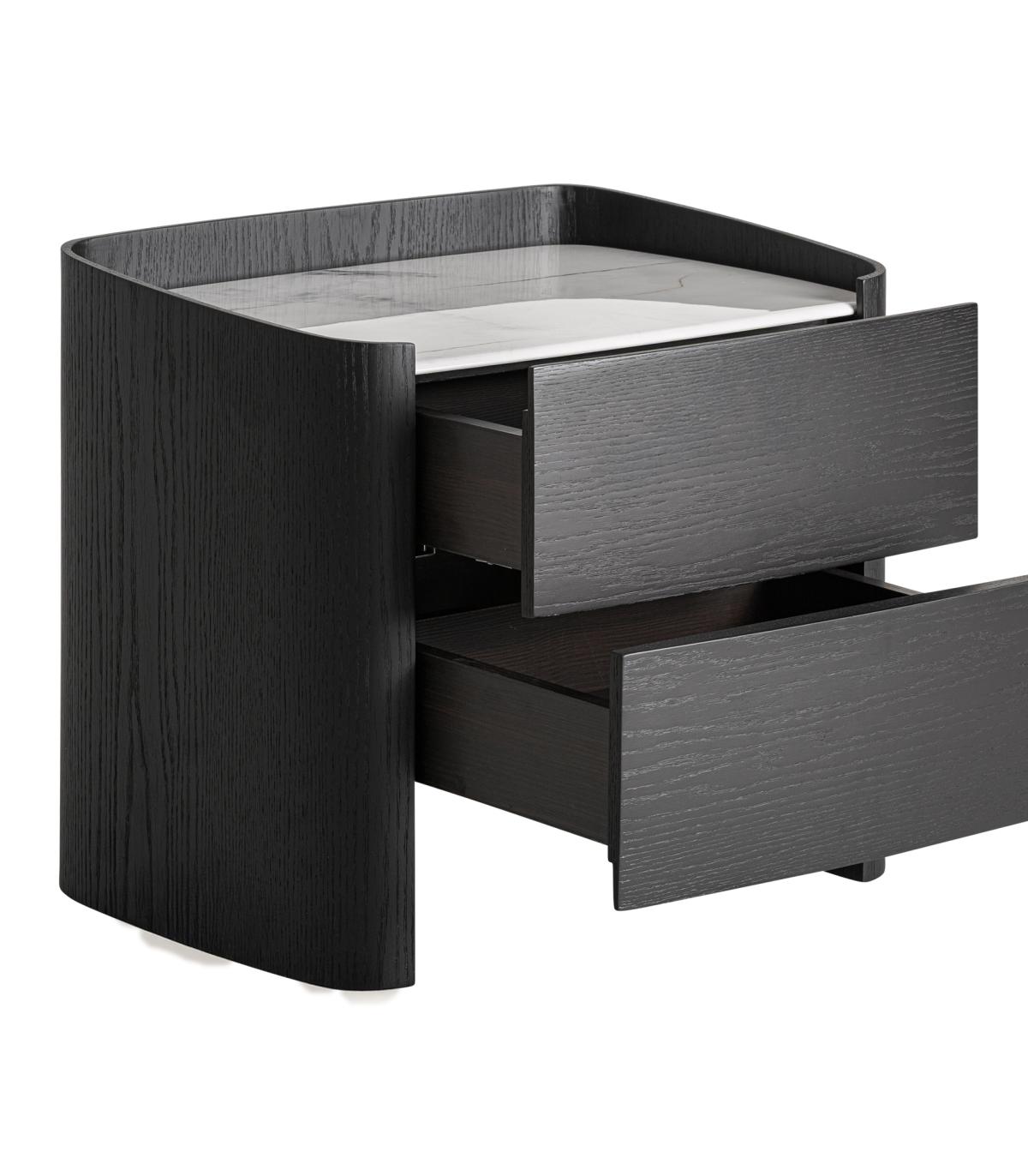 Mesita de noche Haesa de estilo contemporáneo fabricado en madera contrachapada en color negro combinado con chapa de roble en color negro y piedra sinterizada en color negro.