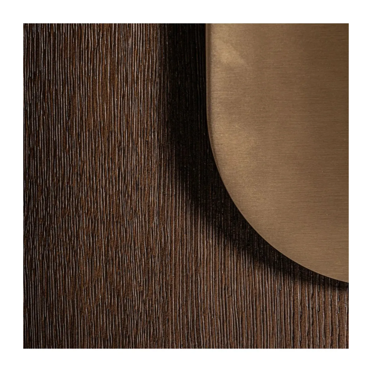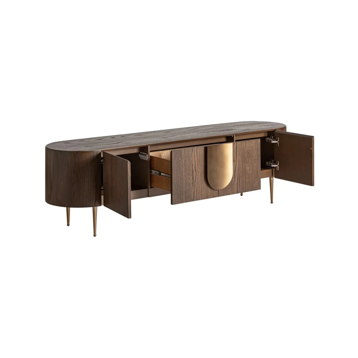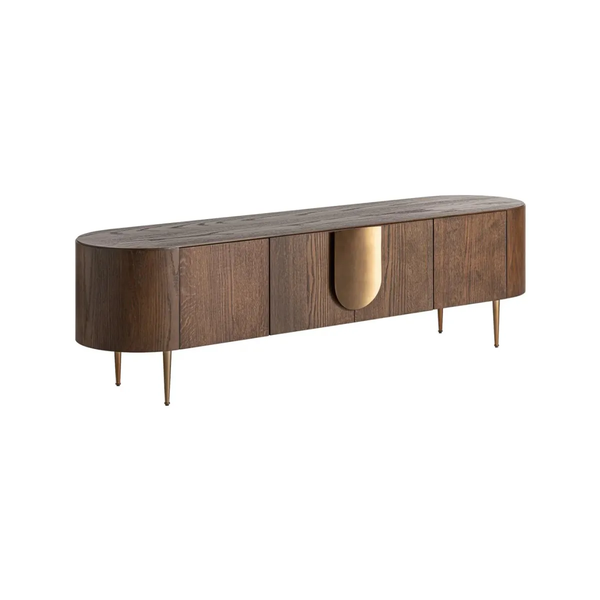 Mueble tv Treignac de estilo art deco fabricado en chapa de roble en color marrón con acabado teñido combinado con madera dm y acero inoxidable en color oro con acabado mate. Producto desmontable.