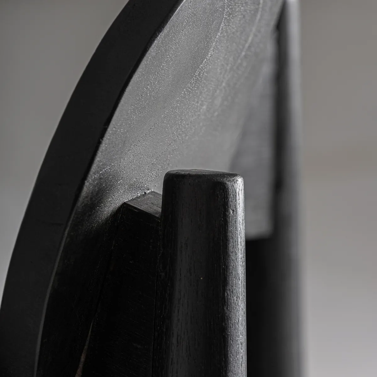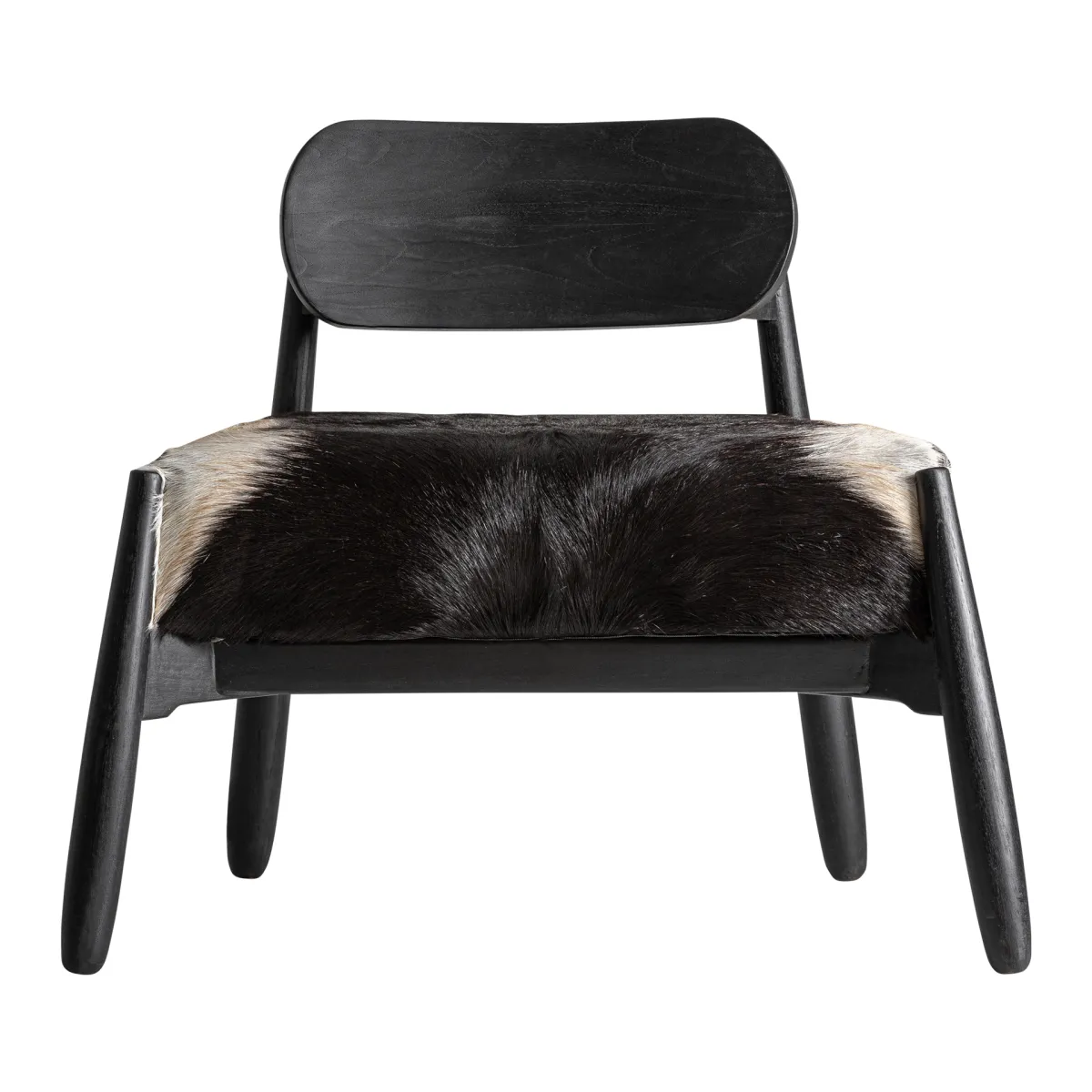 Sillón fabricado en madera de teka en color negro combinado con piel en color blanco en color negro.