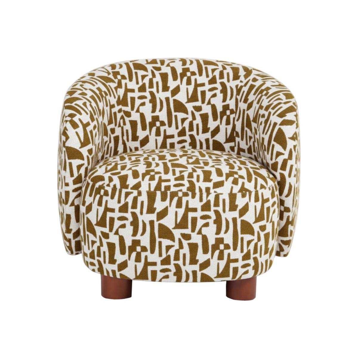 SILLÓN ESTAMPADO CREMA-OCRE TEJIDO-METAL 80 X 82 X 62 CM Material: tejido 100% poliéster - estructura madera conglomerada. Patas madera de caucho. Patas para montar. Relleno: foam Altura asiento: cm. Cumple normativa EN12520:2025