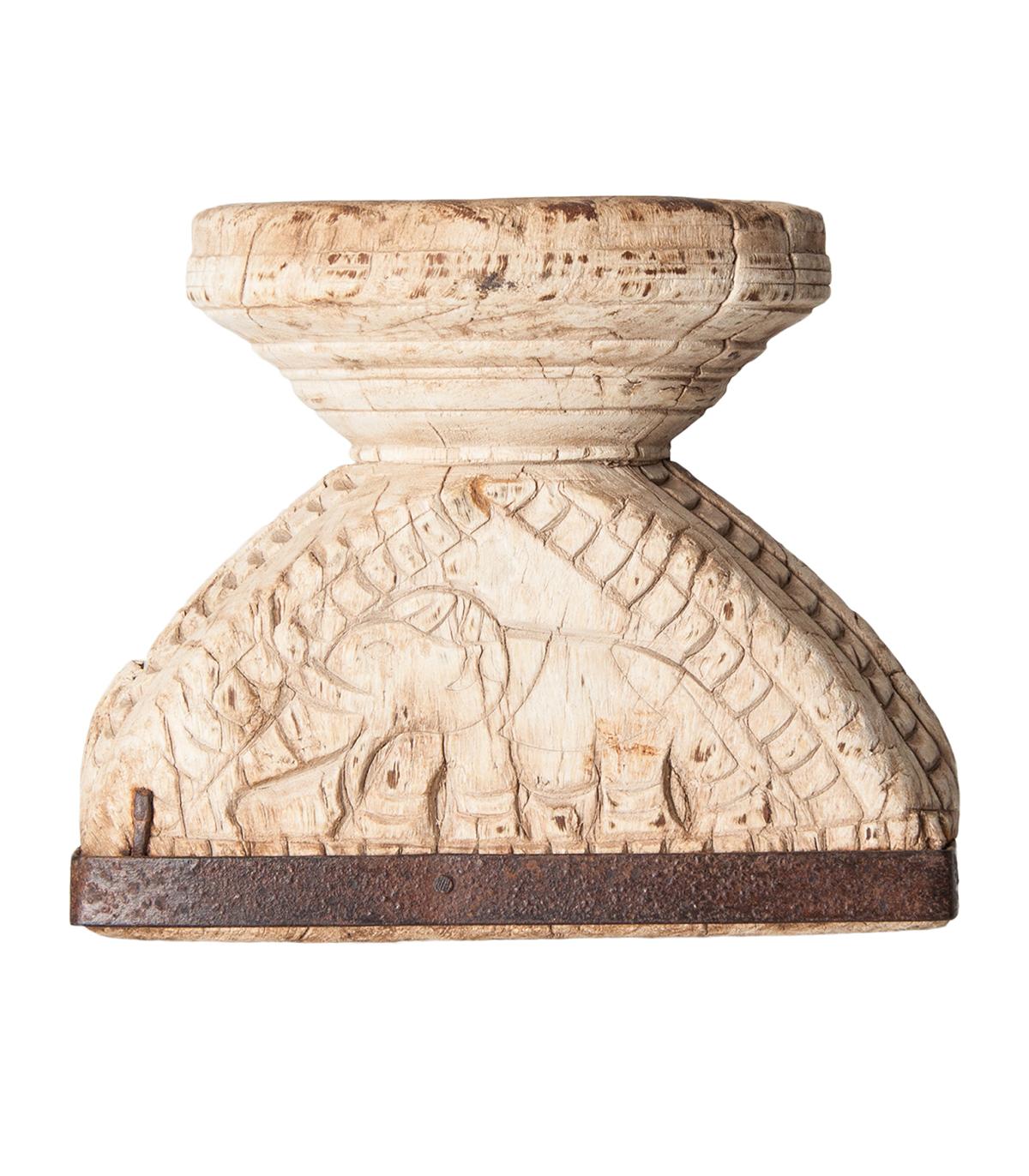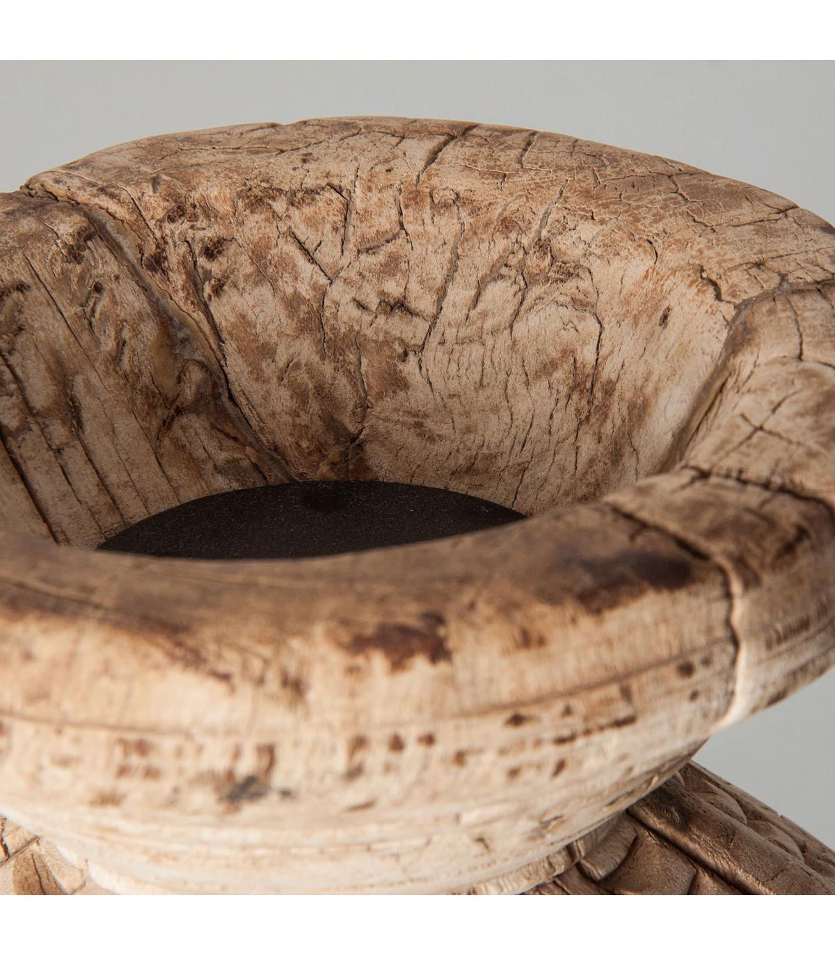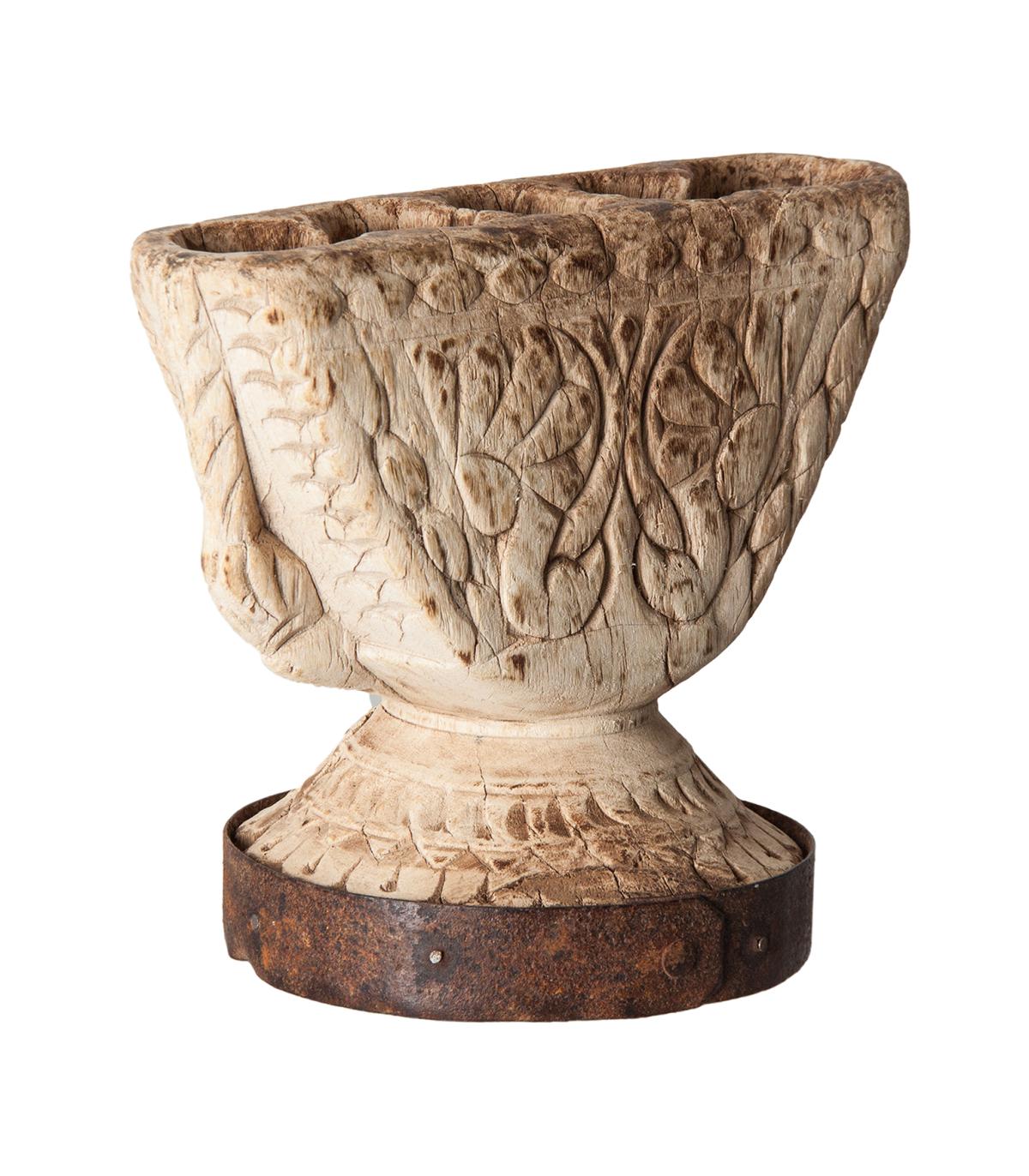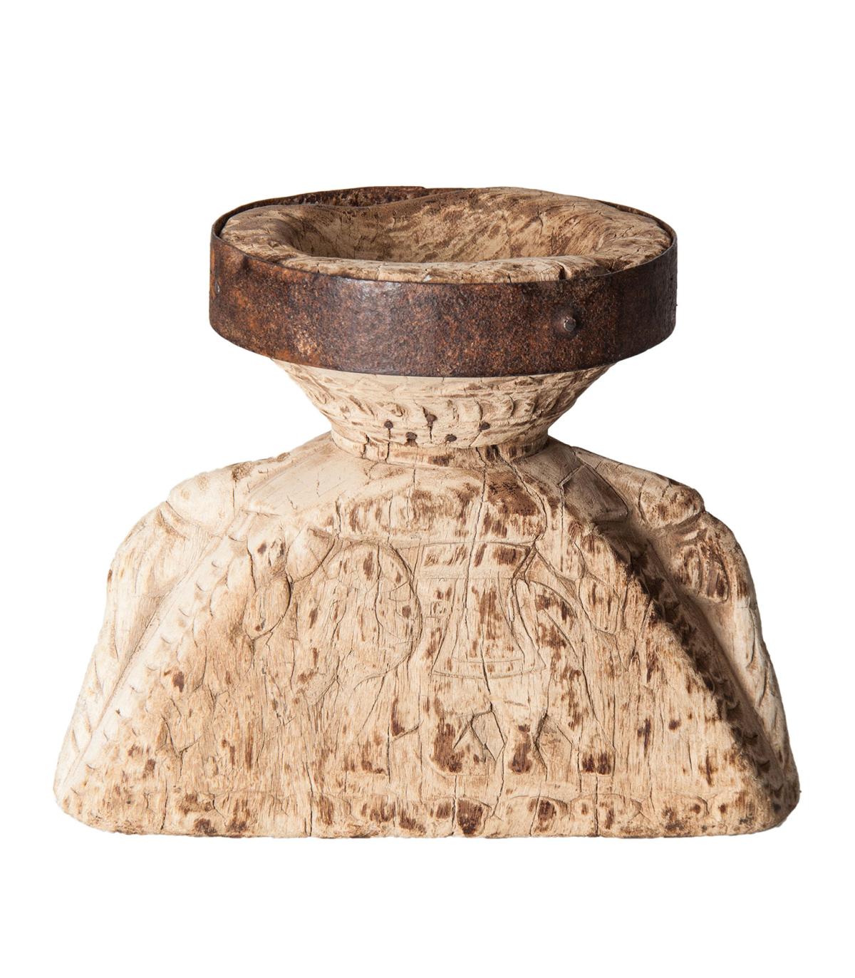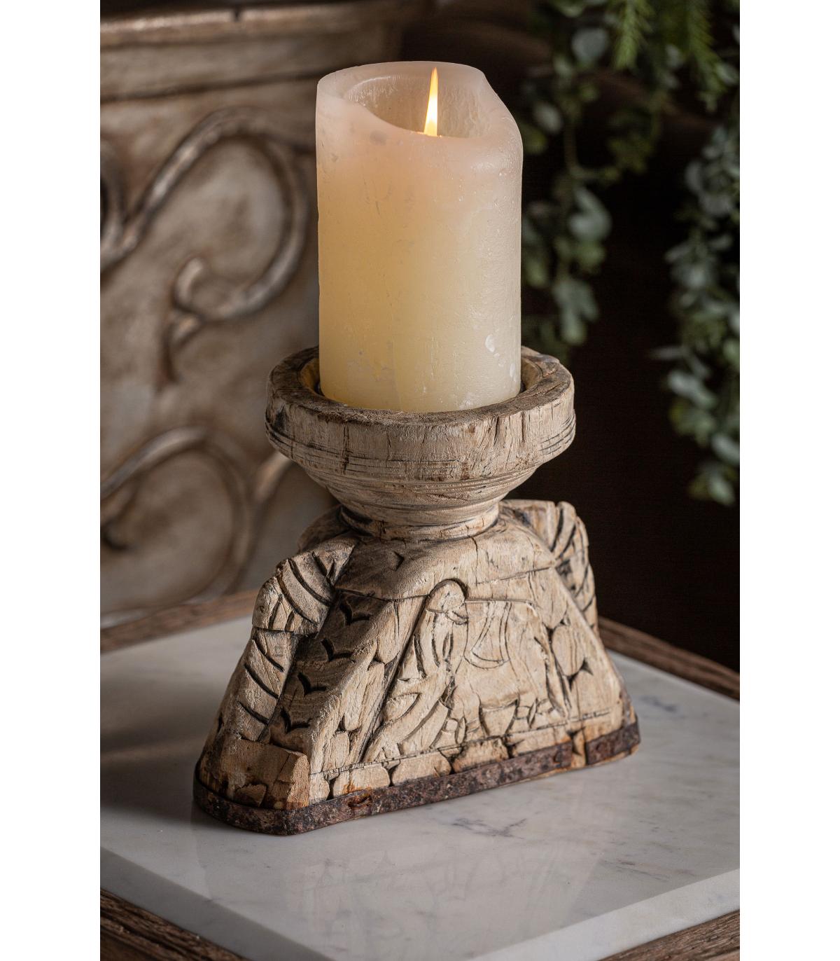 Portavela de estilo étnico fabricado en madera de teka en color blanco roto con acabado envejecido combinado con hierro.