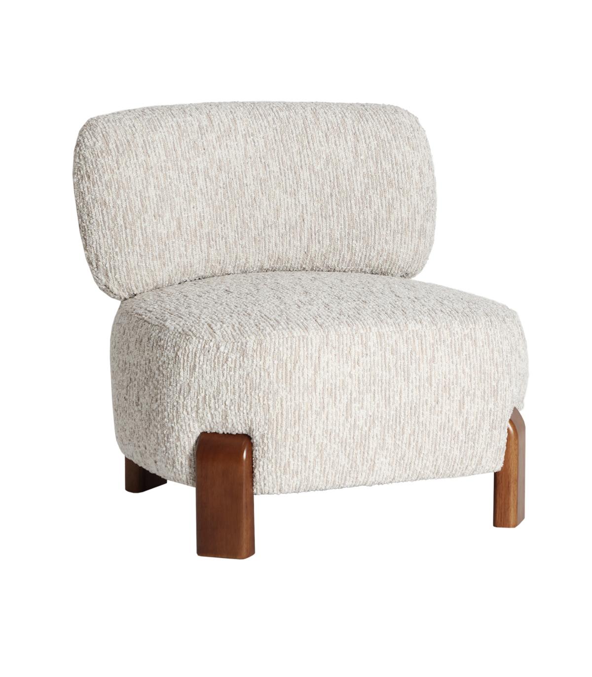 Sillón, fabricado en poliéster en color beige, combinado con espuma y madera de pino en color marrón.